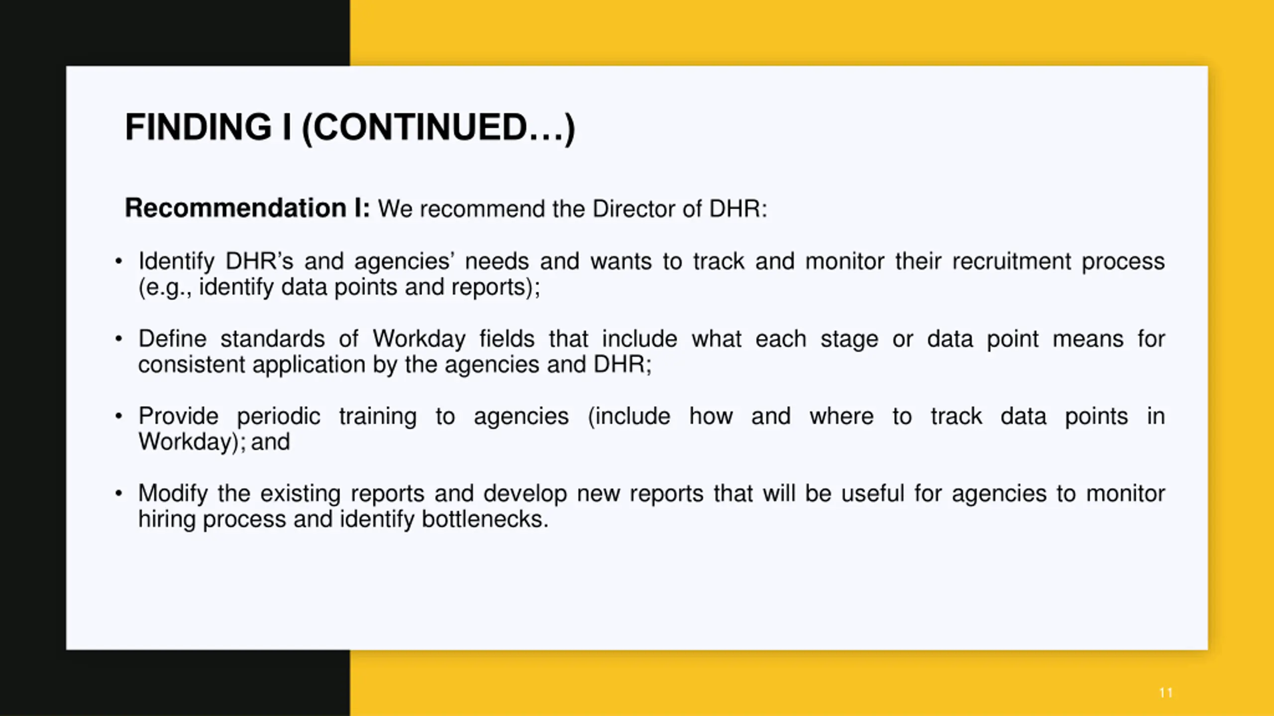 FINDING I (CONTINUED) Recommendation I: We recommend the Director of DHR: Identify DHR s and agencies needs and wants to track and monitor their recruitment process (e.g., identify data points and reports); Define standards of Workday fields that include what each stage or data point means for consistent application by the agencies and DHR; Provide periodic training to agencies (include how and where to track data points in Workday); and Modify the existing reports and develop new reports that will be useful for agencies to monitor hiring process and identify bottlenecks. 11