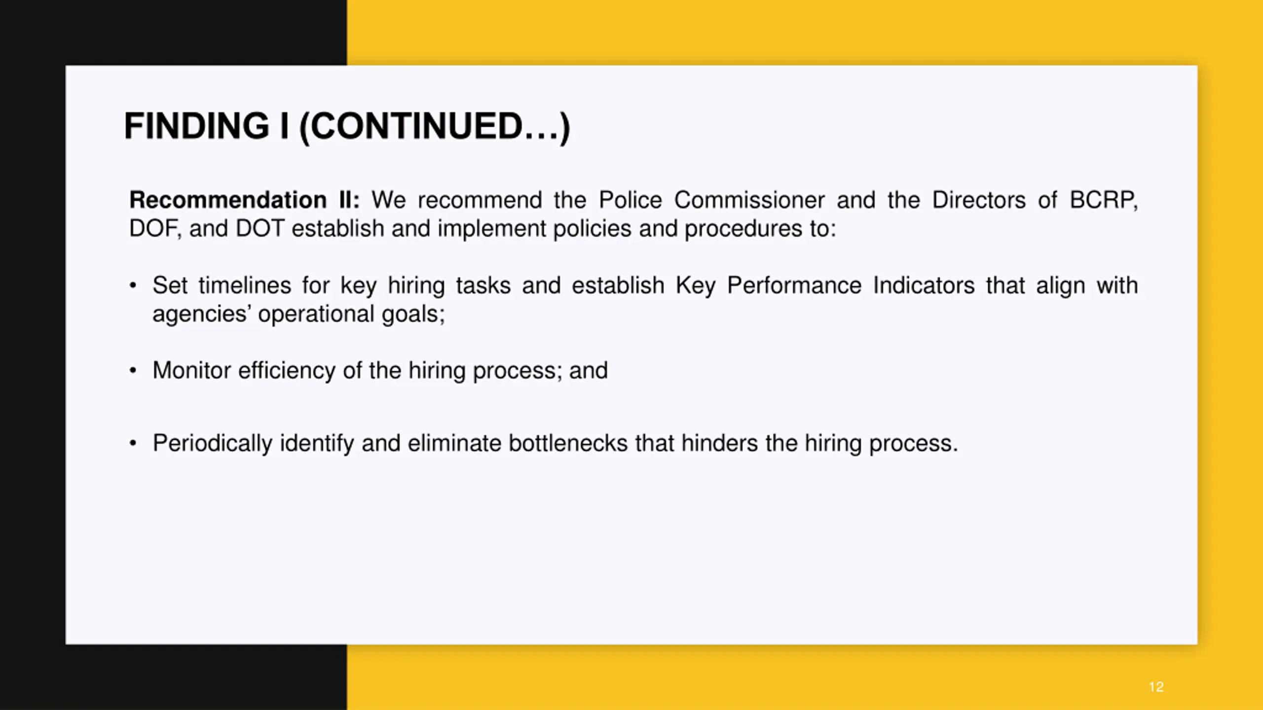 FINDING I (CONTINUED) Recommendation II: We recommend the Police Commissioner and the Directors of BCRP, DOF, and DOT establish and implement policies and procedures to: Set timelines for key hiring tasks and establish Key Performance Indicators that align with agencies operational goals; Monitor efficiency of the hiring process; and Periodically identify and eliminate bottlenecks that hinders the hiring process. 12
