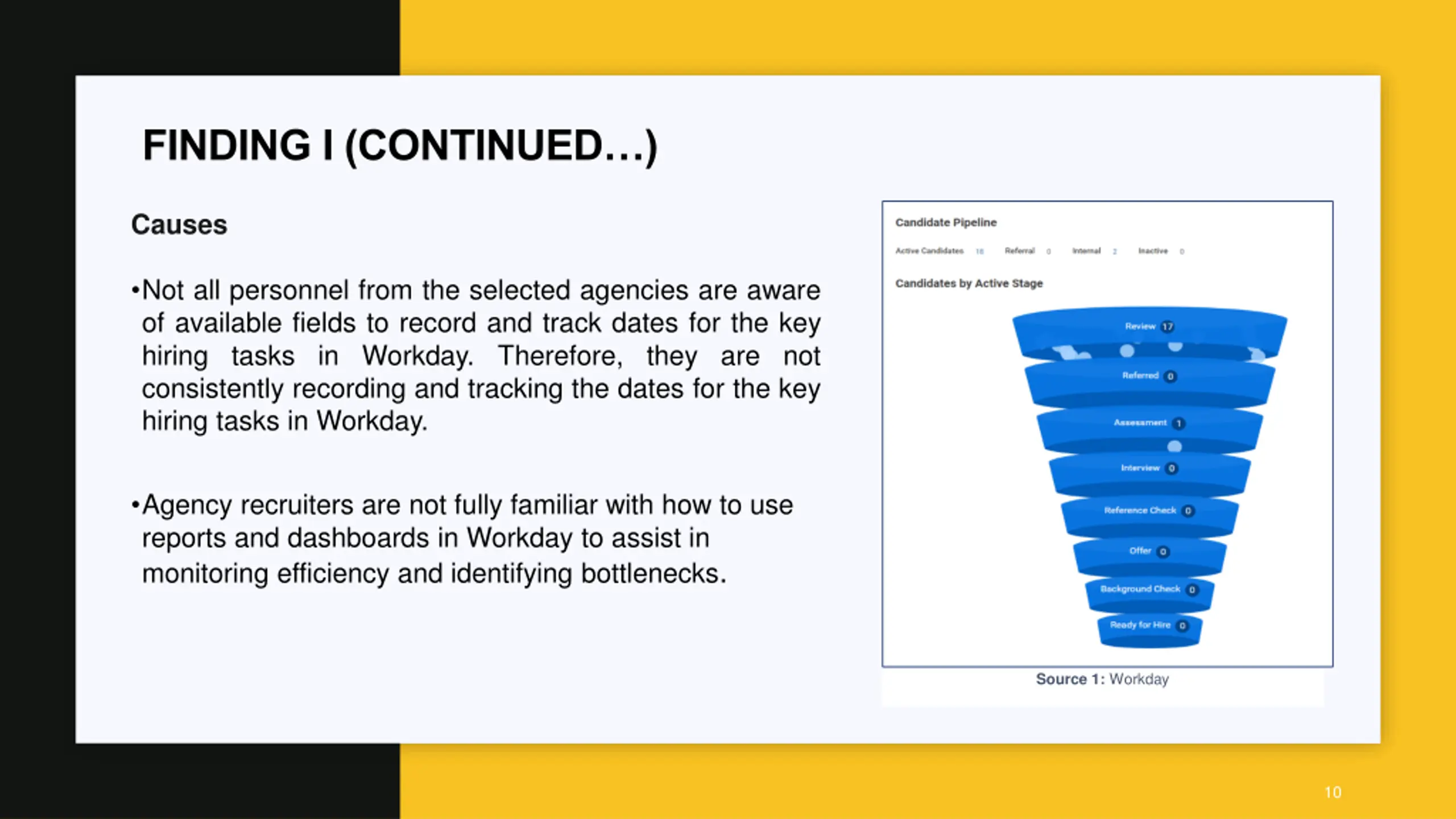 FINDING I (CONTINUED) Causes Not all personnel from the selected agencies are aware of available fields to record and track dates for the key hiring tasks in Workday. Therefore, they are not consistently recording and tracking the dates for the key hiring tasks in Workday. Agency recruiters are not fully familiar with how to use reports and dashboards in Workday to assist in monitoring efficiency and identifying bottlenecks. Source 1: Workday 10