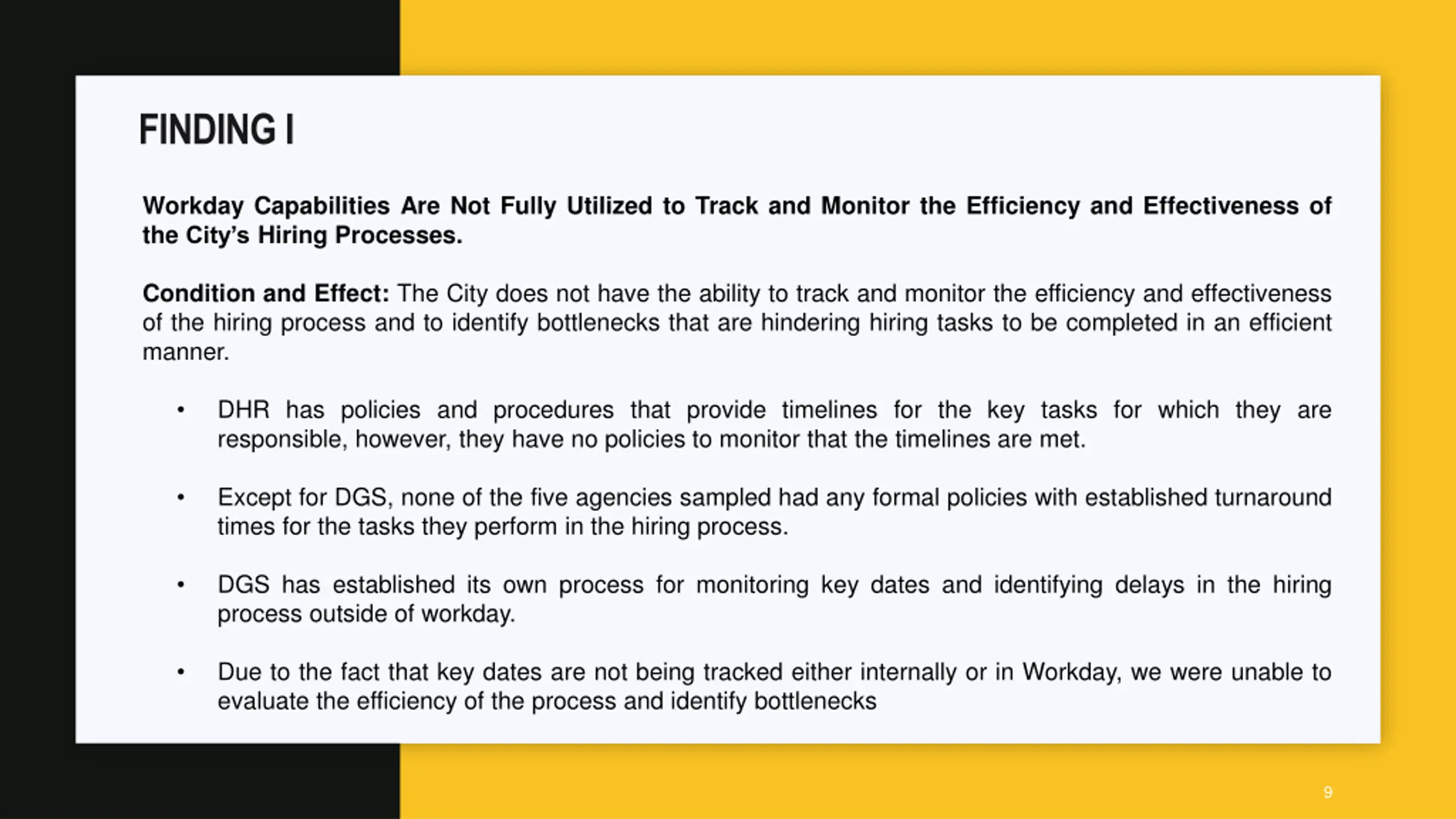 FINDING I Workday Capabilities Are Not Fully Utilized to Track and Monitor the Efficiency and Effectiveness of the City s Hiring Processes. Condition and Effect: TheCity does not have the ability to track and monitor the efficiency and effectiveness of the hiring process and to identify bottlenecks that are hindering hiring tasks to be completed in an efficient manner. DHR has policies and procedures that provide timelines for the key tasks for which they are responsible, however, they have no policies to monitor that the timelines are met. Except for DGS, none of the five agencies sampled had any formal policies with established turnaround times for the tasks they perform in the hiring process. DGS has established its own process for monitoring key dates and identifying delays in the hiring process outside of workday. Due to the fact that key dates are not being tracked either internally or in Workday, we were unable to evaluate the efficiency of the process and identify bottlenecks 9