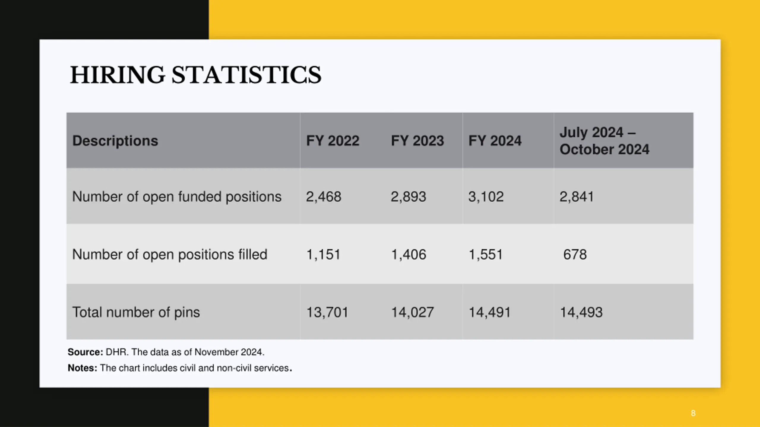 HIRING STATISTICS July 2024 October 2024 Descriptions FY 2022 FY 2023 FY 2024 Number of open funded positions 2,468 2,893 3,102 2,841 Number of open positions filled 1,151 1,406 1,551 678 Total number of pins 13,701 14,027 14,491 14,493 Source: DHR. The data as of November 2024. Notes: The chart includes civil and non-civil services. 8