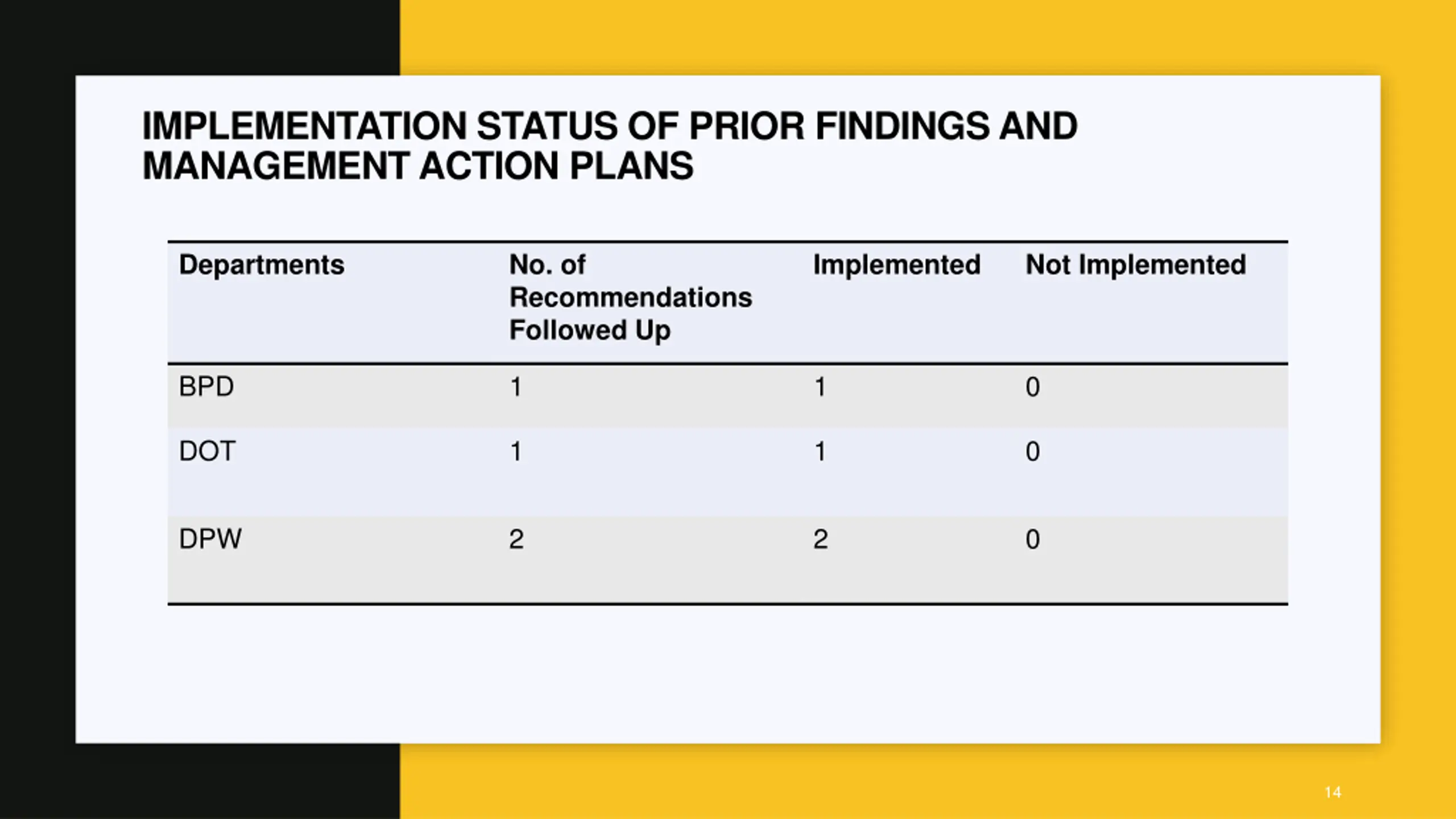 IMPLEMENTATION STATUS OF PRIOR FINDINGS AND MANAGEMENT ACTION PLANS Departments No. of Recommendations Followed Up Implemented Not Implemented BPD 1 1 0 DOT 1 1 0 DPW 2 2 0 14