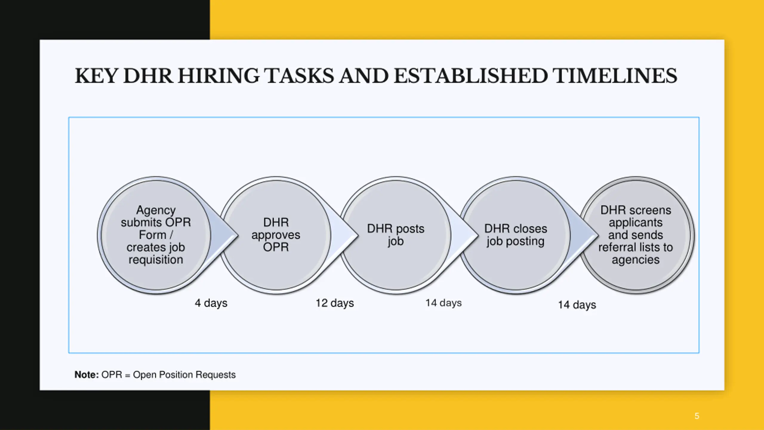 KEY DHR HIRING TASKS AND ESTABLISHED TIMELINES Agency submits OPR Form / creates job requisition DHR screens applicants and sends referral lists to agencies DHR approves OPR DHR posts job DHR closes job posting 14 days 4 days 12 days 14 days Note: OPR = Open Position Requests 5
