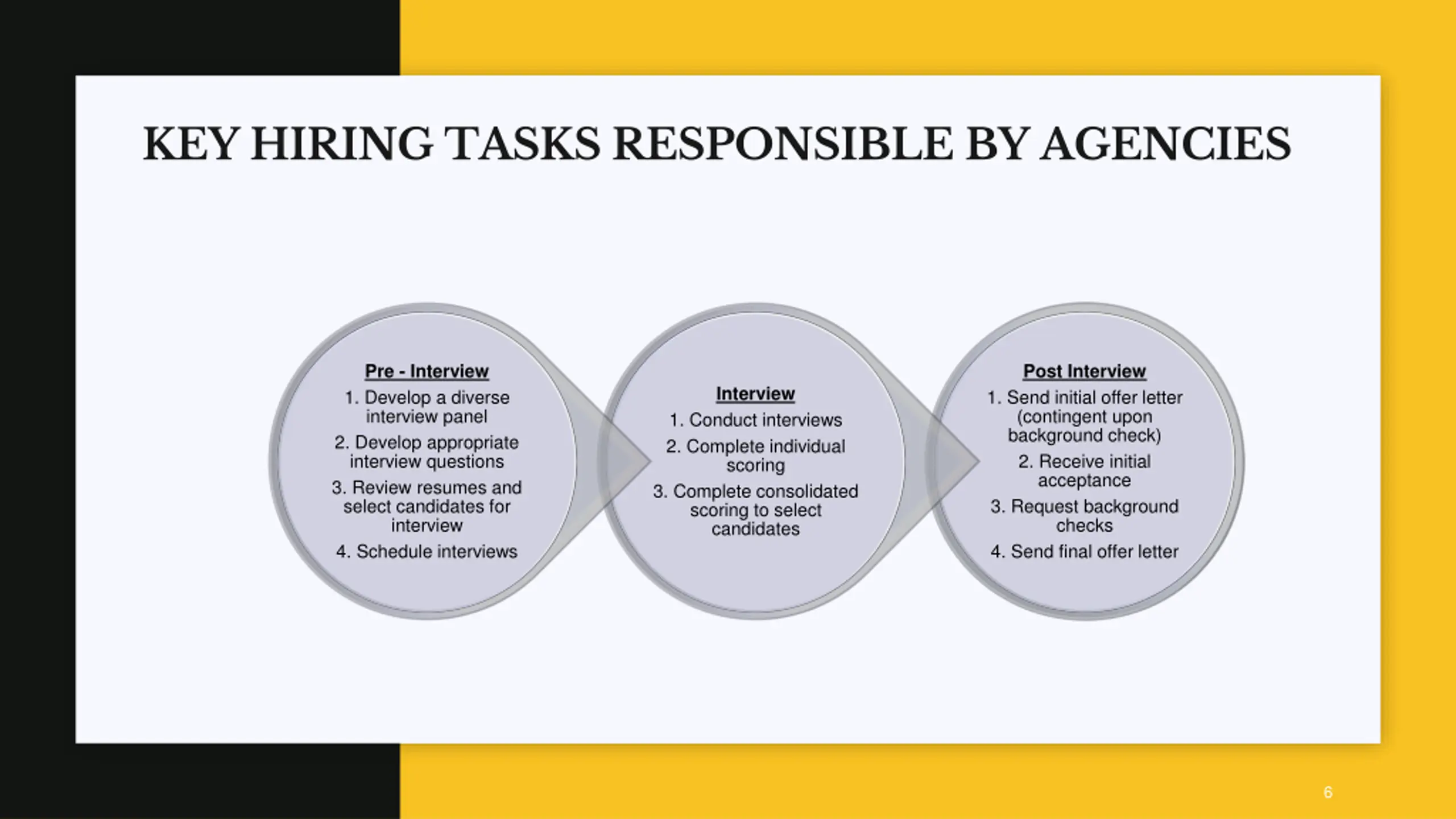 KEY HIRING TASKS RESPONSIBLE BY AGENCIES Pre - Interview 1. Develop a diverse interview panel 2. Develop appropriate interview questions 3. Review resumes and select candidates for interview 4. Schedule interviews Post Interview 1. Send initial offer letter (contingent upon background check) 2. Receive initial acceptance 3. Request background checks 4. Send final offer letter Interview 1. Conduct interviews 2. Complete individual scoring 3. Complete consolidated scoring to select candidates 6