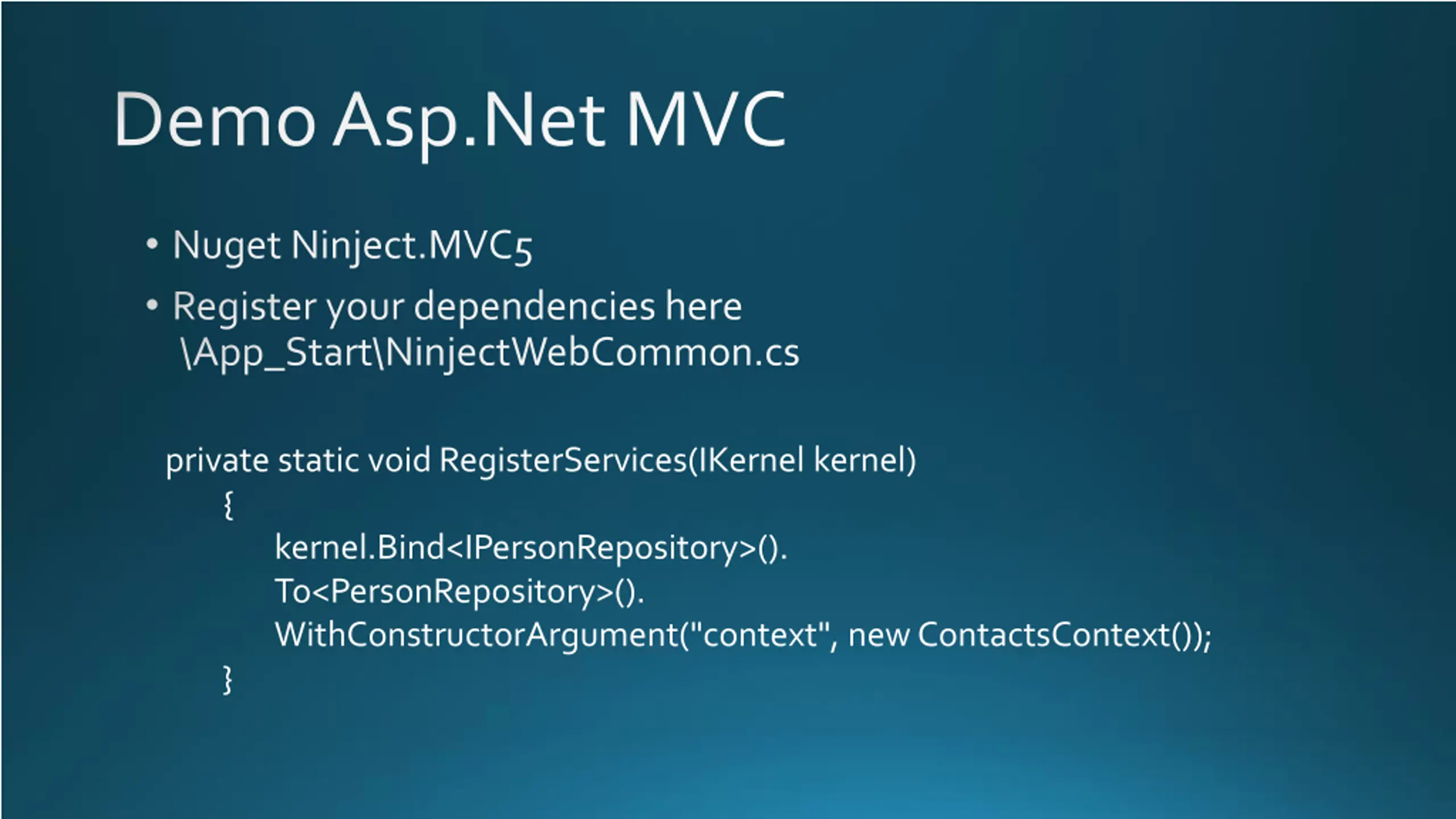 Demo Asp.NetMVC Nuget Ninject.MVC5 Register your dependencies here \App_Start\NinjectWebCommon.cs private static void RegisterServices(IKernel kernel) { kernel.Bind<IPersonRepository>(). To<PersonRepository>(). WithConstructorArgument("context", new ContactsContext()); }