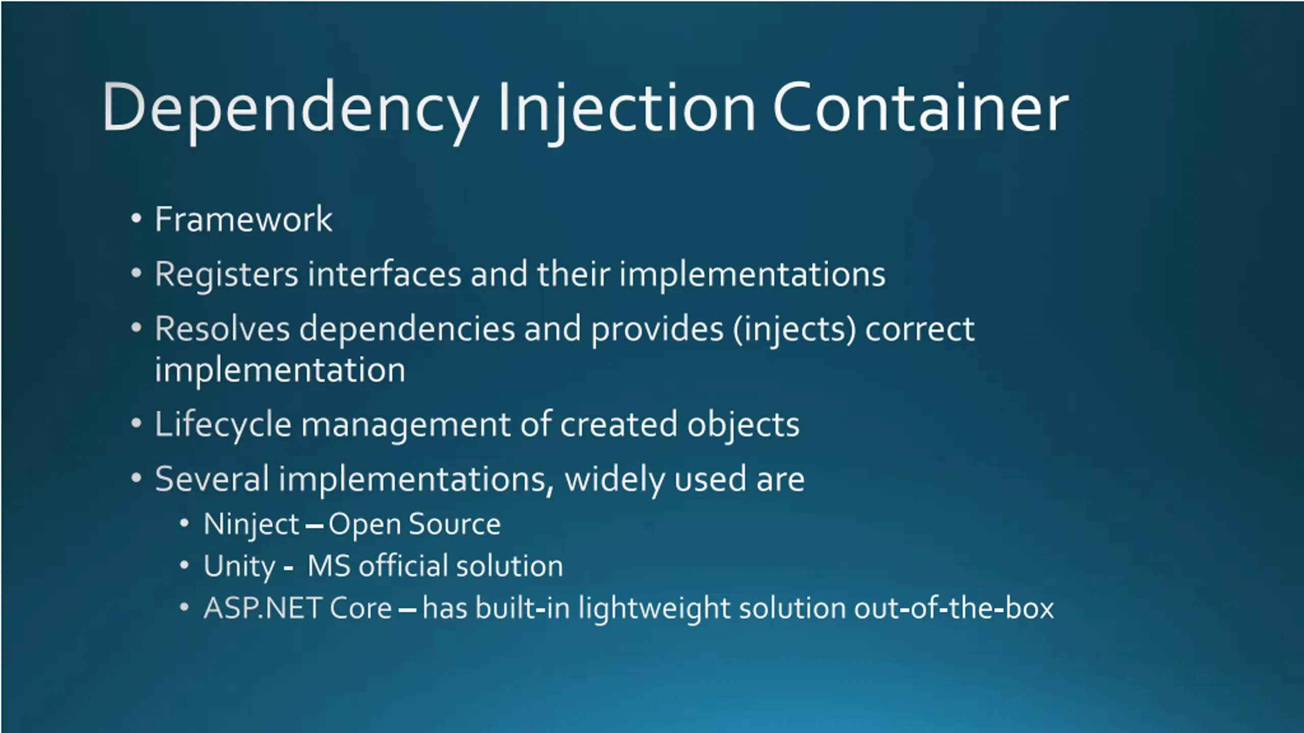 Dependency Injection Container Framework Registers interfaces and their implementations Resolves dependencies and provides (injects) correct implementation Lifecycle management of created objects Several implementations, widely used are Ninject Open Source Unity - MS official solution ASP.NET Core has built-in lightweight solution out-of-the-box