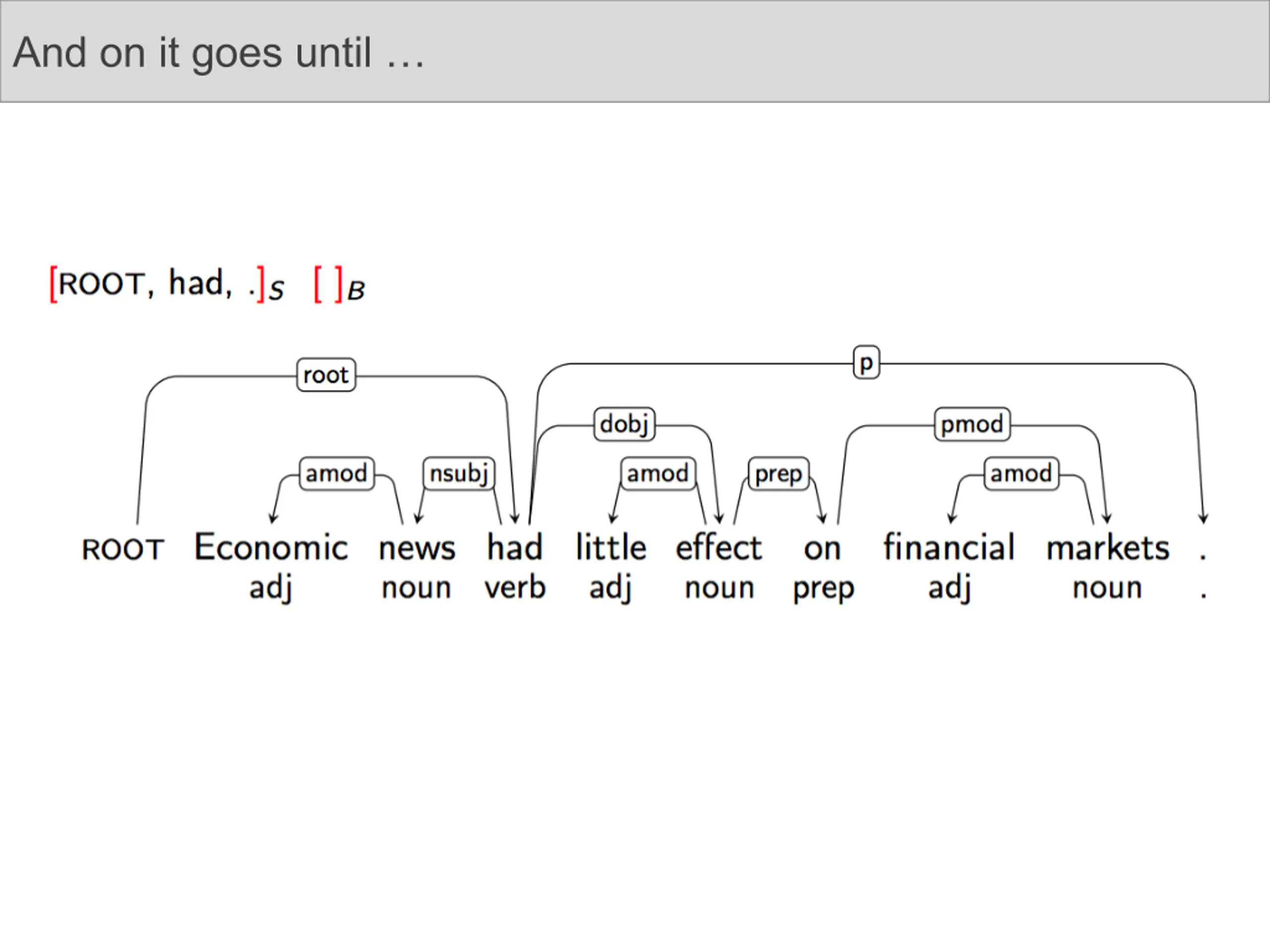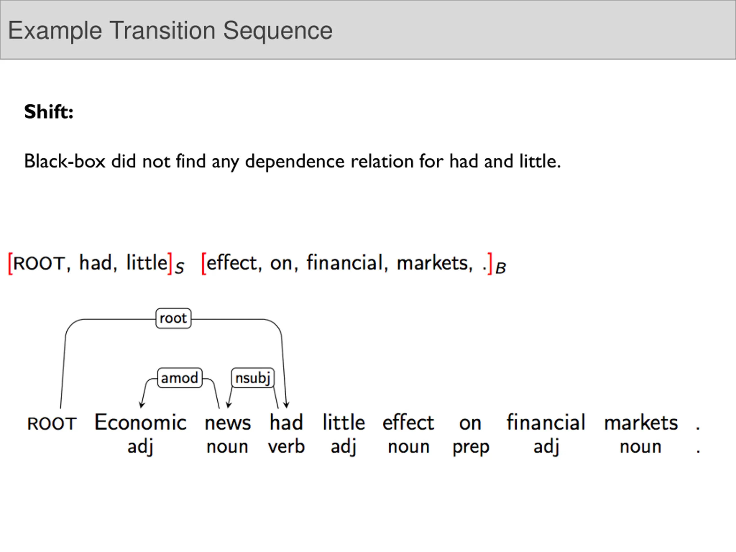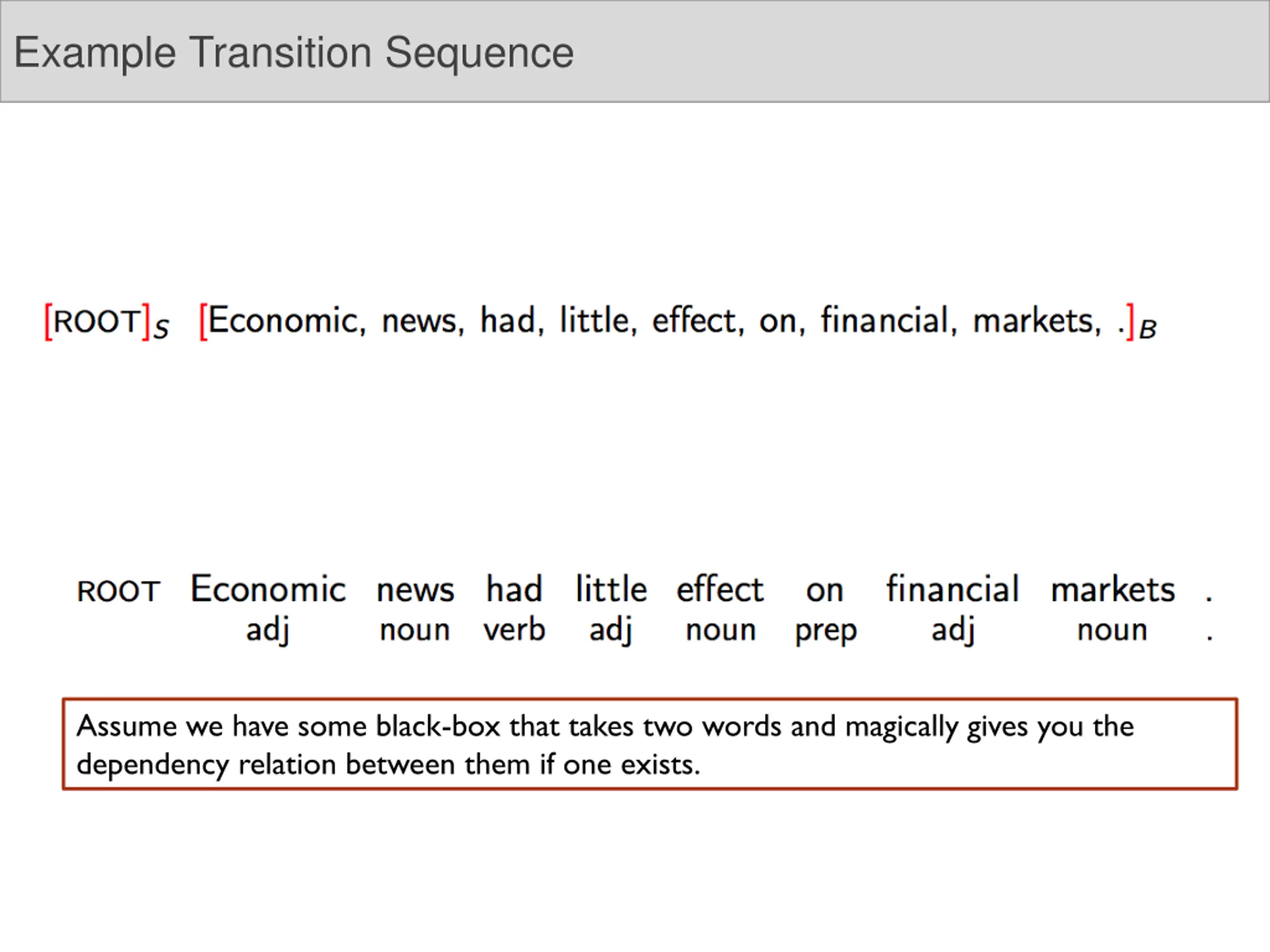 Example Transition Sequence Assume we have some black-box that takes two words and magically gives you the dependency relation between them if one exists.