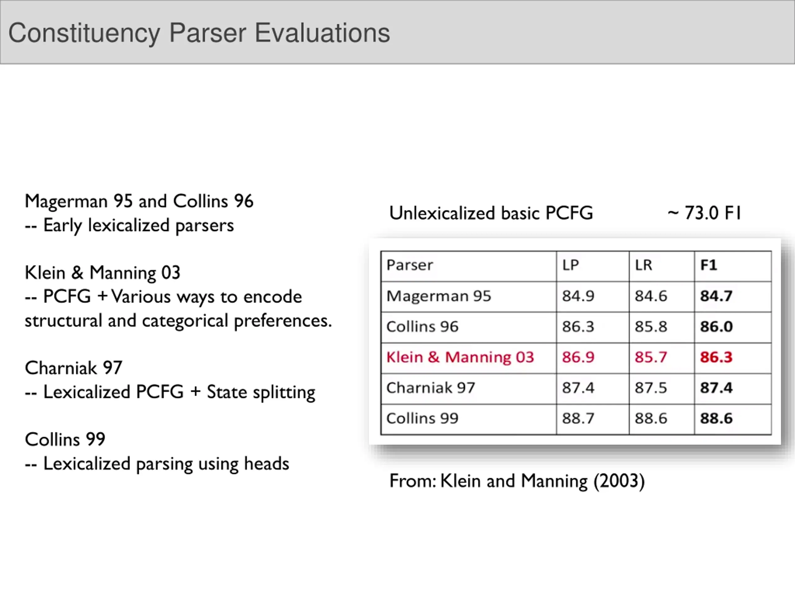 Constituency Parser Evaluations Magerman 95 and Collins 96 -- Early lexicalized parsers Unlexicalized basic PCFG ~ 73.0 F1 Klein & Manning 03 -- PCFG + Various ways to encode structural and categorical preferences. Charniak 97 -- Lexicalized PCFG + State splitting Collins 99 -- Lexicalized parsing using heads From: Klein and Manning (2003)