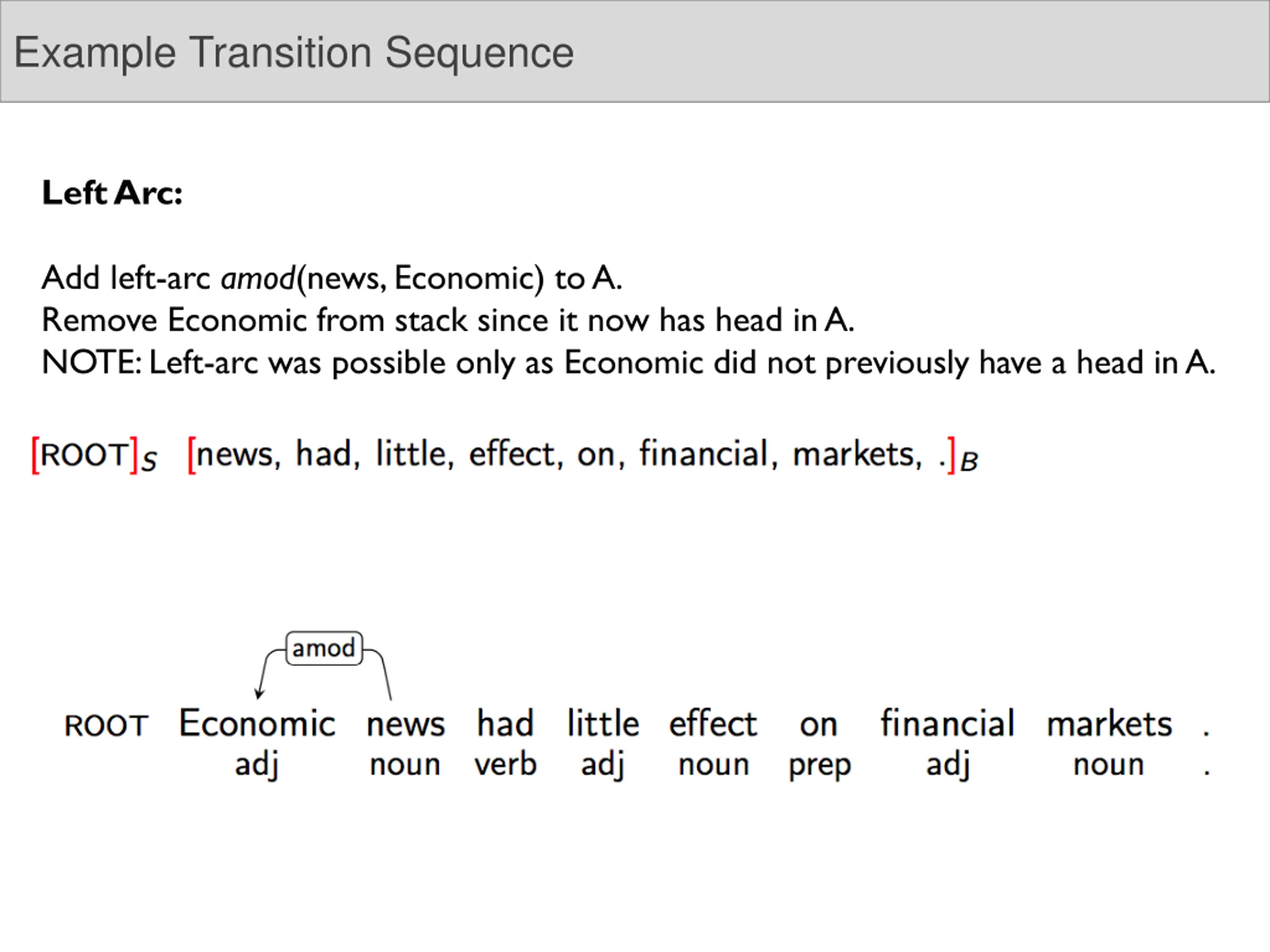 Example Transition Sequence Left Arc: Add left-arc amod(news, Economic) to A. Remove Economic from stack since it now has head in A. NOTE: Left-arc was possible only as Economic did not previously have a head in A.