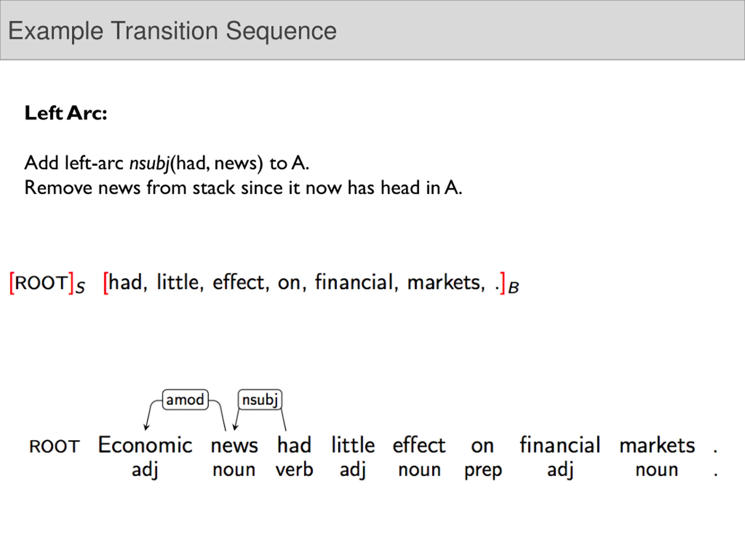 Example Transition Sequence Left Arc: Add left-arc nsubj(had, news) to A. Remove news from stack since it now has head in A.