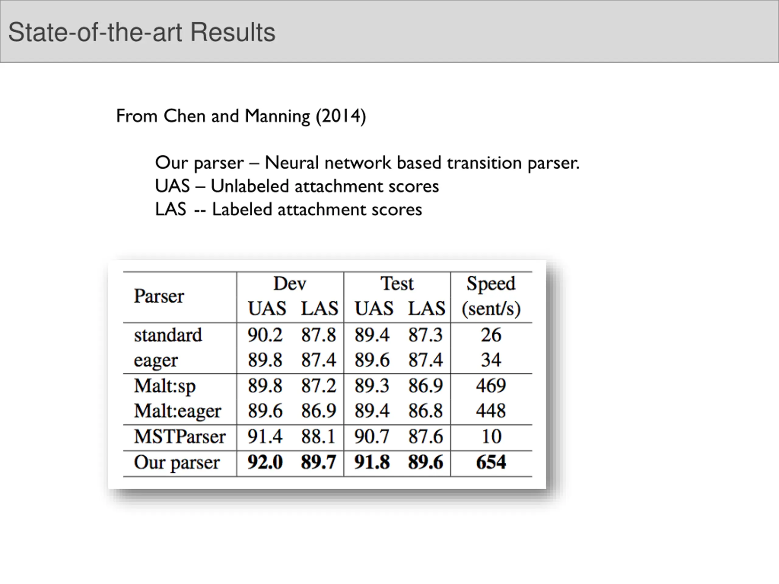 State-of-the-art Results From Chen and Manning (2014) Our parser Neural network based transition parser. UAS Unlabeled attachment scores LAS -- Labeled attachment scores