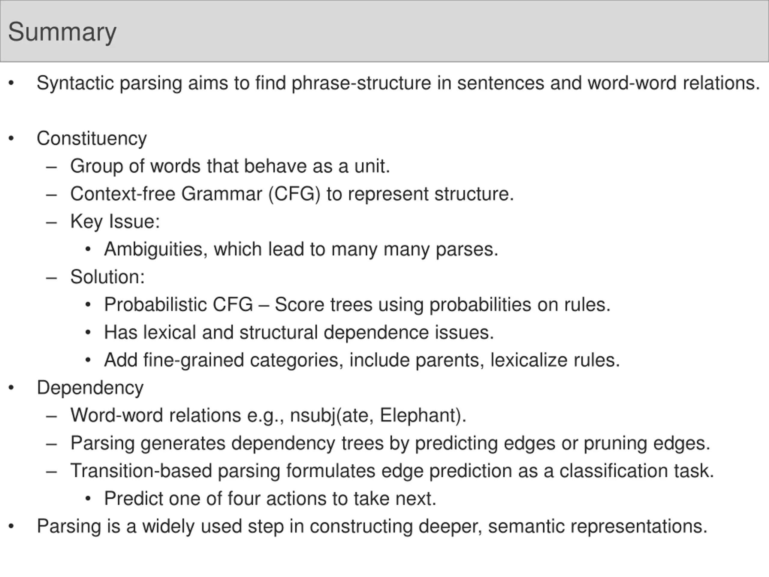 Summary Syntactic parsing aims to find phrase-structure in sentences and word-word relations. Constituency Group of words that behave as a unit. Context-free Grammar (CFG) to represent structure. Key Issue: Ambiguities, which lead to many many parses. Solution: Probabilistic CFG Score trees using probabilities on rules. Has lexical and structural dependence issues. Add fine-grained categories, include parents, lexicalize rules. Dependency Word-word relations e.g., nsubj(ate, Elephant). Parsing generates dependency trees by predicting edges or pruning edges. Transition-based parsing formulates edge prediction as a classification task. Predict one of four actions to take next. Parsing is a widely used step in constructing deeper, semantic representations.