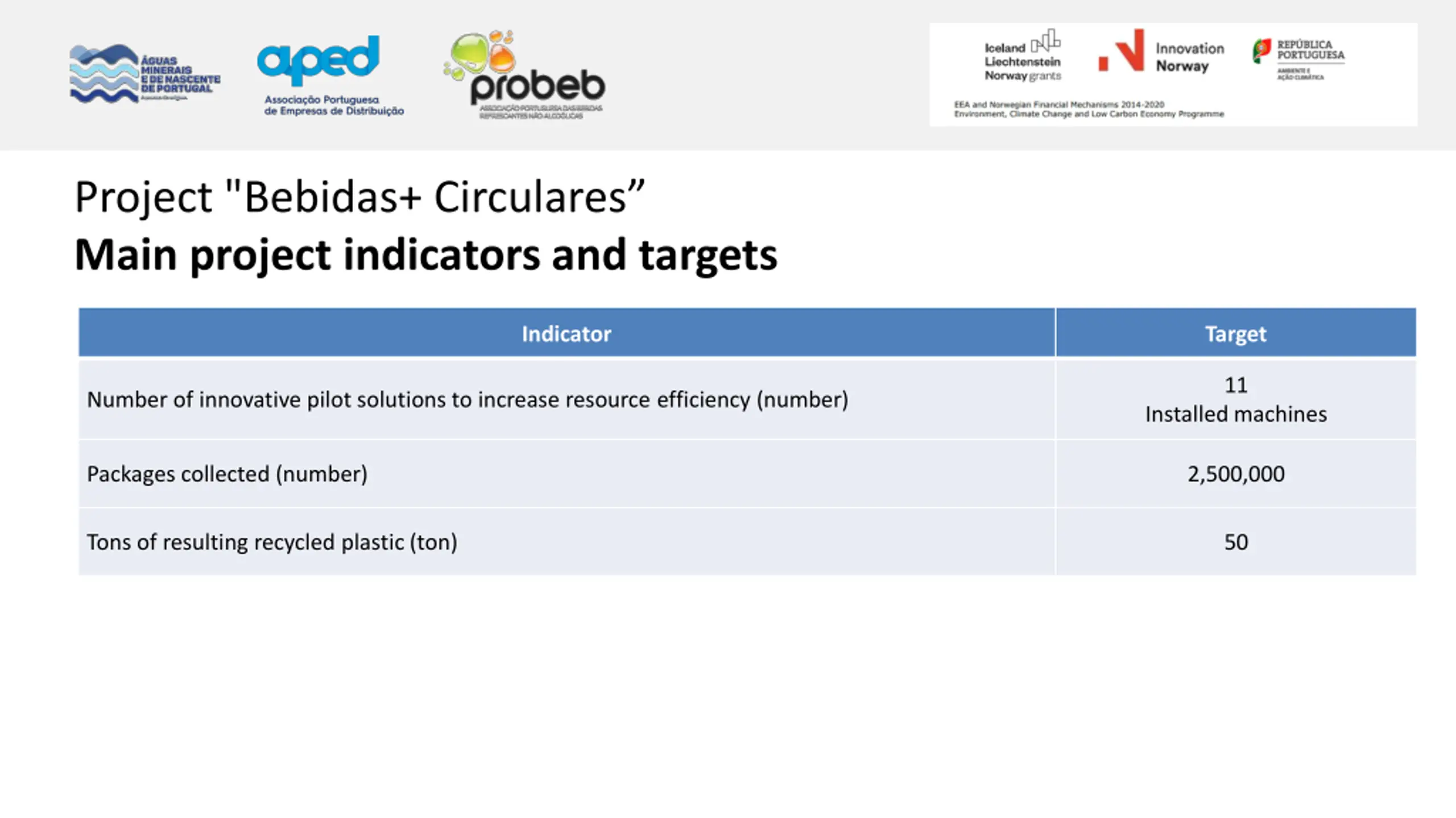 Project "Bebidas+ Circulares Main project indicators and targets Indicator Target 11 Number of innovative pilot solutions to increase resource efficiency (number) Installed machines Packages collected (number) 2,500,000 Tons of resulting recycled plastic (ton) 50