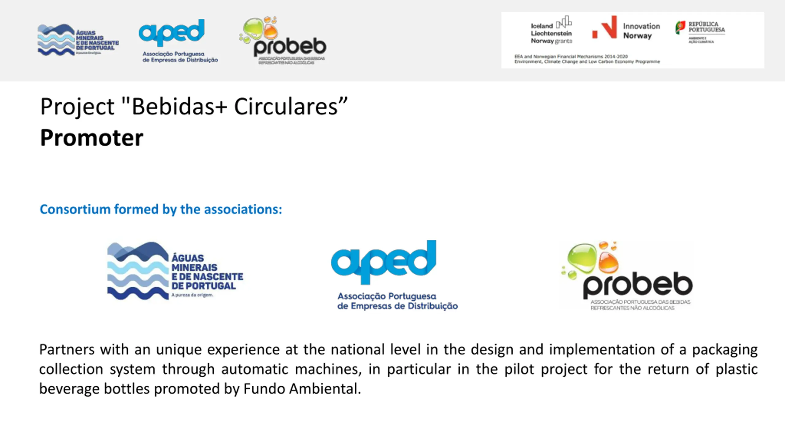 Project "Bebidas+ Circulares Promoter Consortium formed by the associations: Partners with an unique experience at the national level in the design and implementation of a packaging collection system through automatic machines, in particular in the pilot project for the return of plastic beverage bottles promoted by Fundo Ambiental.