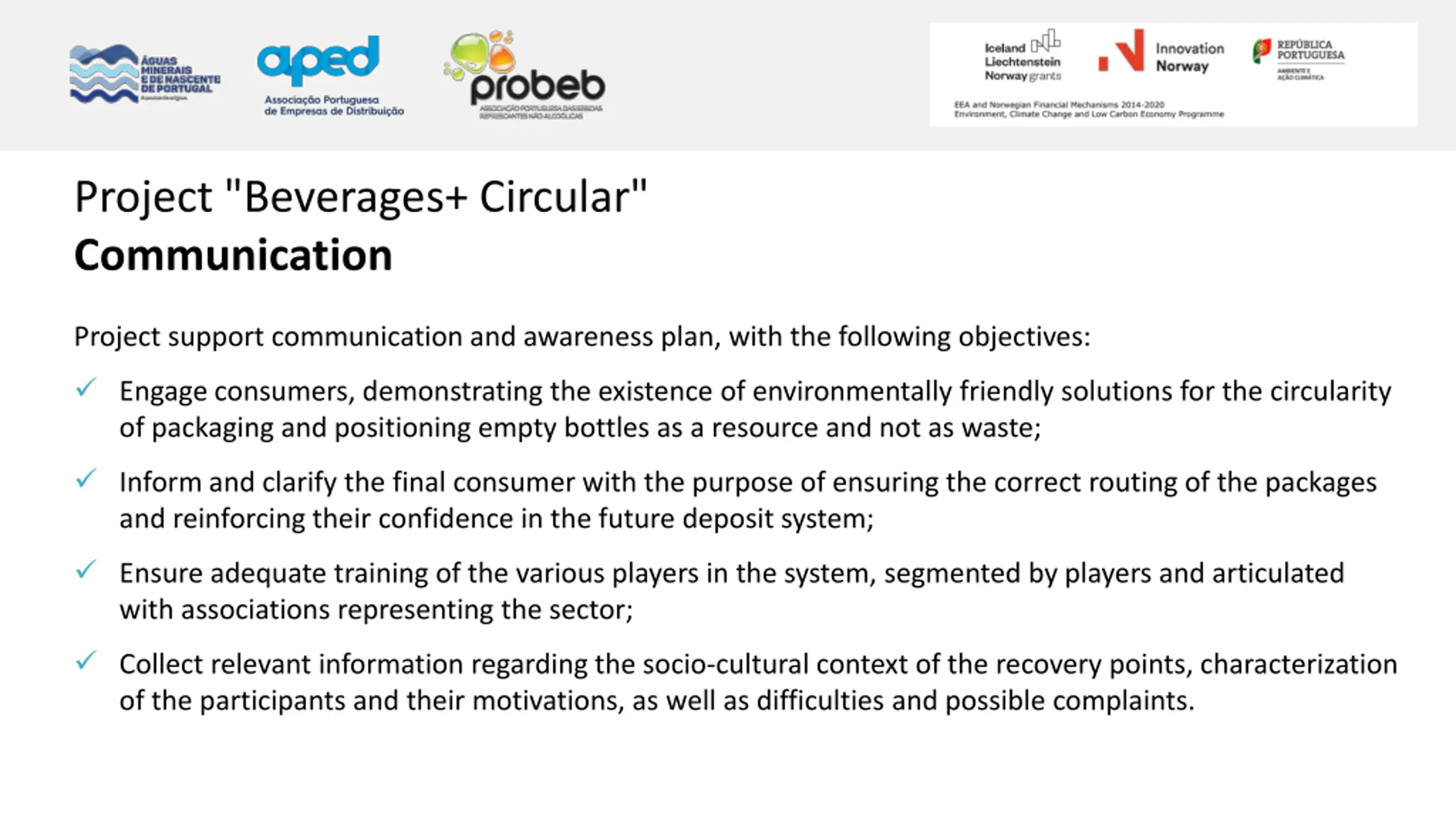 Project "Beverages+ Circular" Communication Project support communication and awareness plan, with the following objectives: Engage consumers, demonstrating the existence of environmentally friendly solutions for the circularity of packaging and positioning empty bottles as a resource and not as waste; Inform and clarify the final consumer with the purpose of ensuring the correct routing of the packages and reinforcing their confidence in the future deposit system; Ensure adequate training of the various players in the system, segmented by players and articulated with associations representing the sector; Collect relevant information regarding the socio-cultural context of the recovery points, characterization of the participants and their motivations, as well as difficulties and possible complaints.