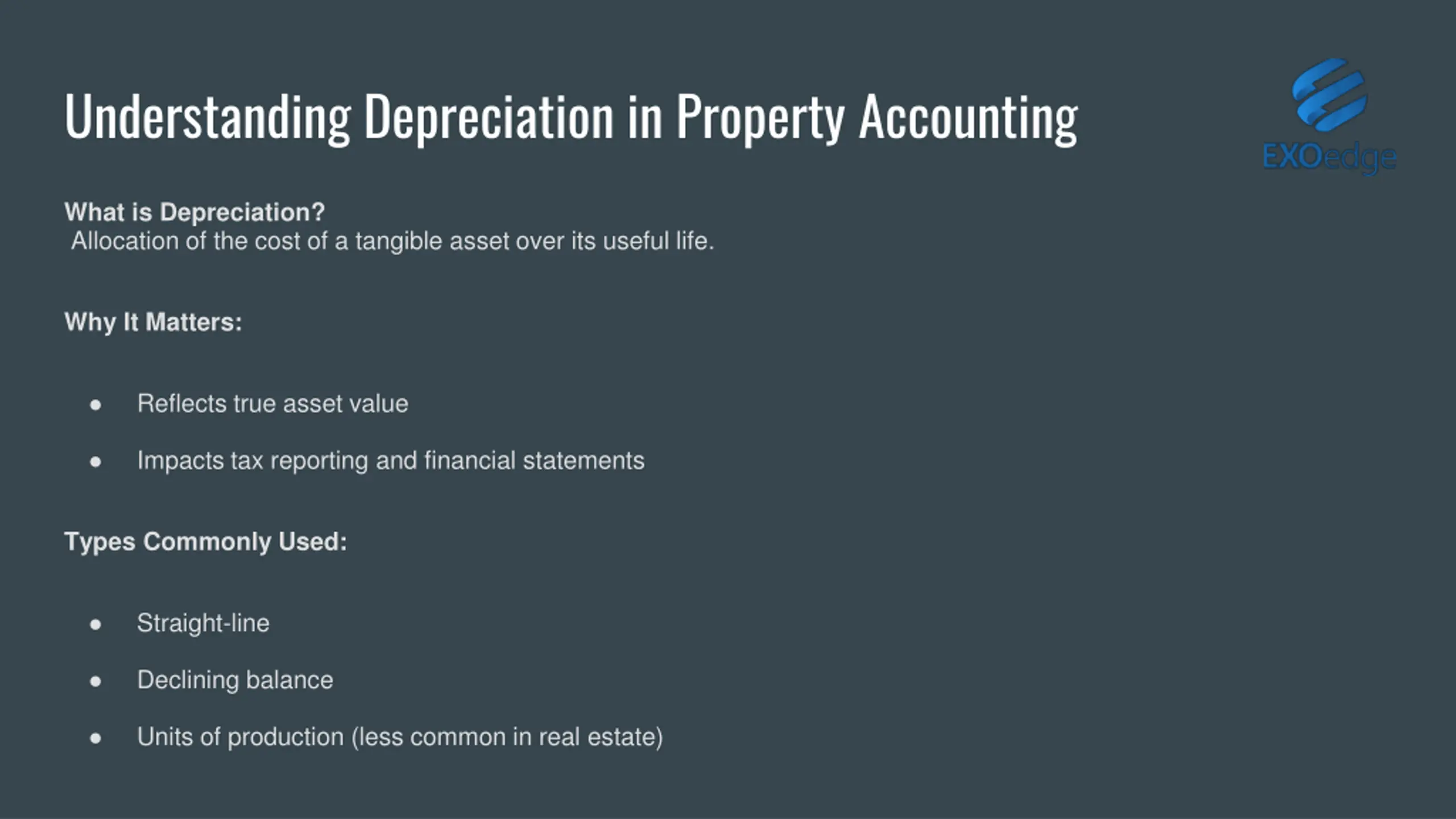 This presentation by EXO Edge highlights the critical role of depreciation and asset management in property accounting. It begins by explaining the concept of depreciation, its impact on financial reporting, and commonly used methods like straight-li