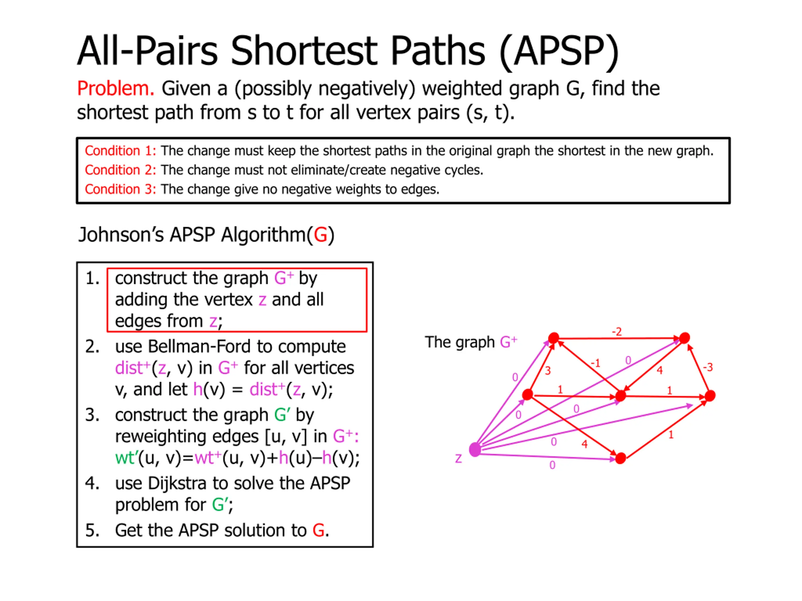 All-Pairs Shortest Paths (APSP) Problem. Given a (possibly negatively) weighted graph G, find the shortest path from s to t for all vertex pairs (s, t). Condition 1: The change must keep the shortest paths in the original graph the shortest in the new graph. Condition 2: The change must not eliminate/create negative cycles. Condition 3: The change give no negative weights to edges. Johnson s APSP Algorithm(G) 1. construct the graph G+ by adding the vertex z and all edges from z; 2. use Bellman-Ford to compute dist+(z, v) in G+ for all vertices v, and let h(v) = dist+(z, v); 3. construct the graph G by reweighting edges [u, v] in G+: wt (u, v)=wt+(u, v)+h(u) h(v); 4. use Dijkstra to solve the APSP problem for G ; 5. Get the APSP solution to G. -2 The graph G -1 -3 4 3 1 1 1 4