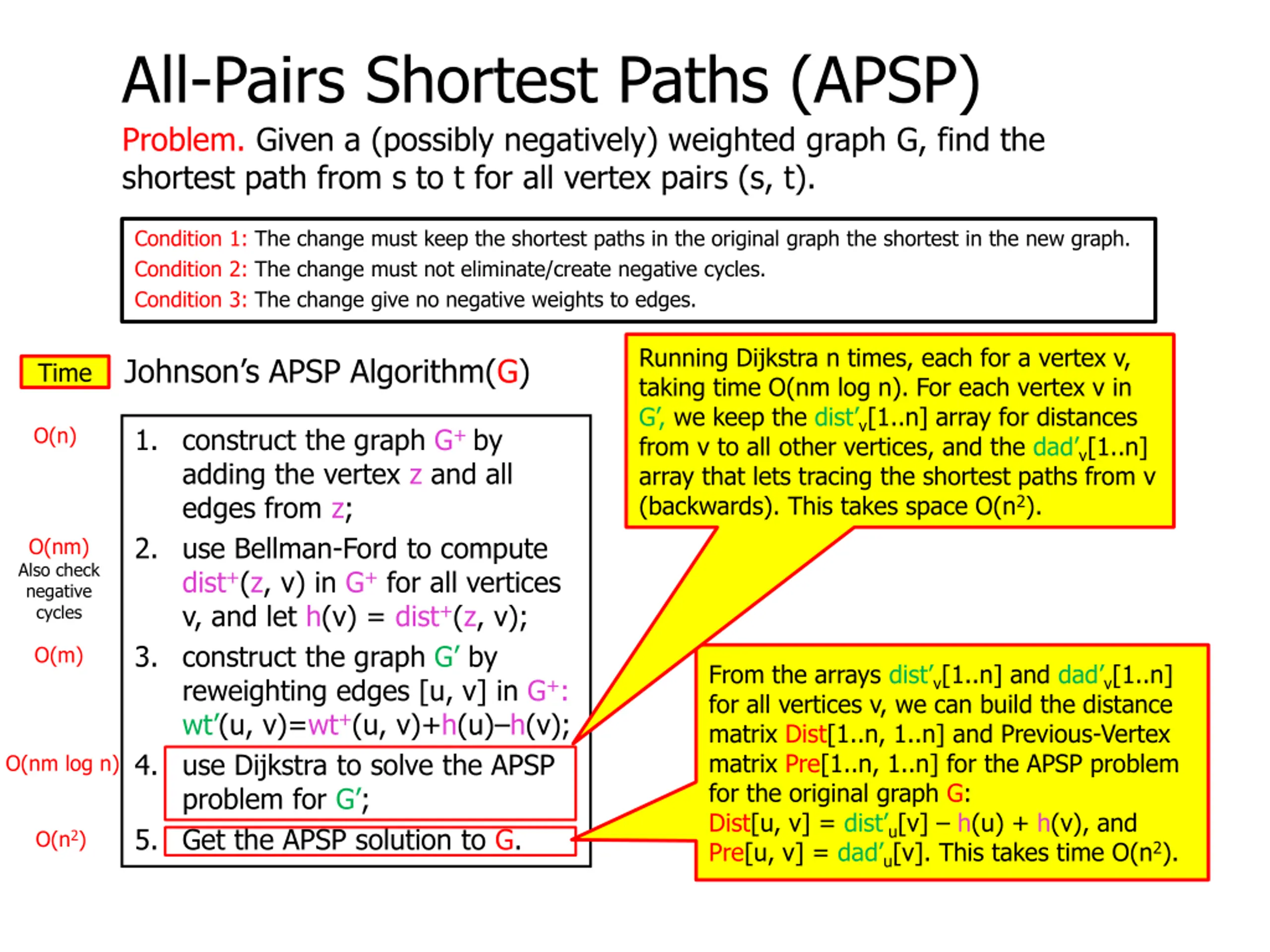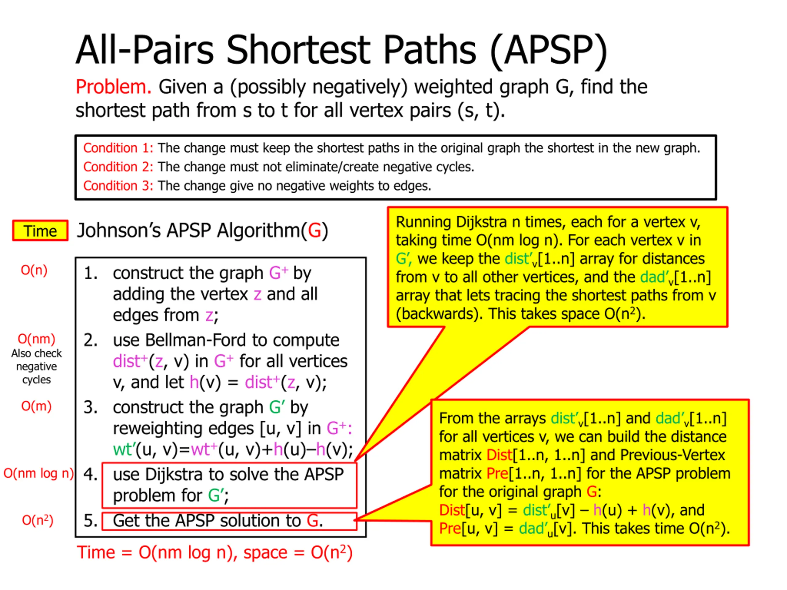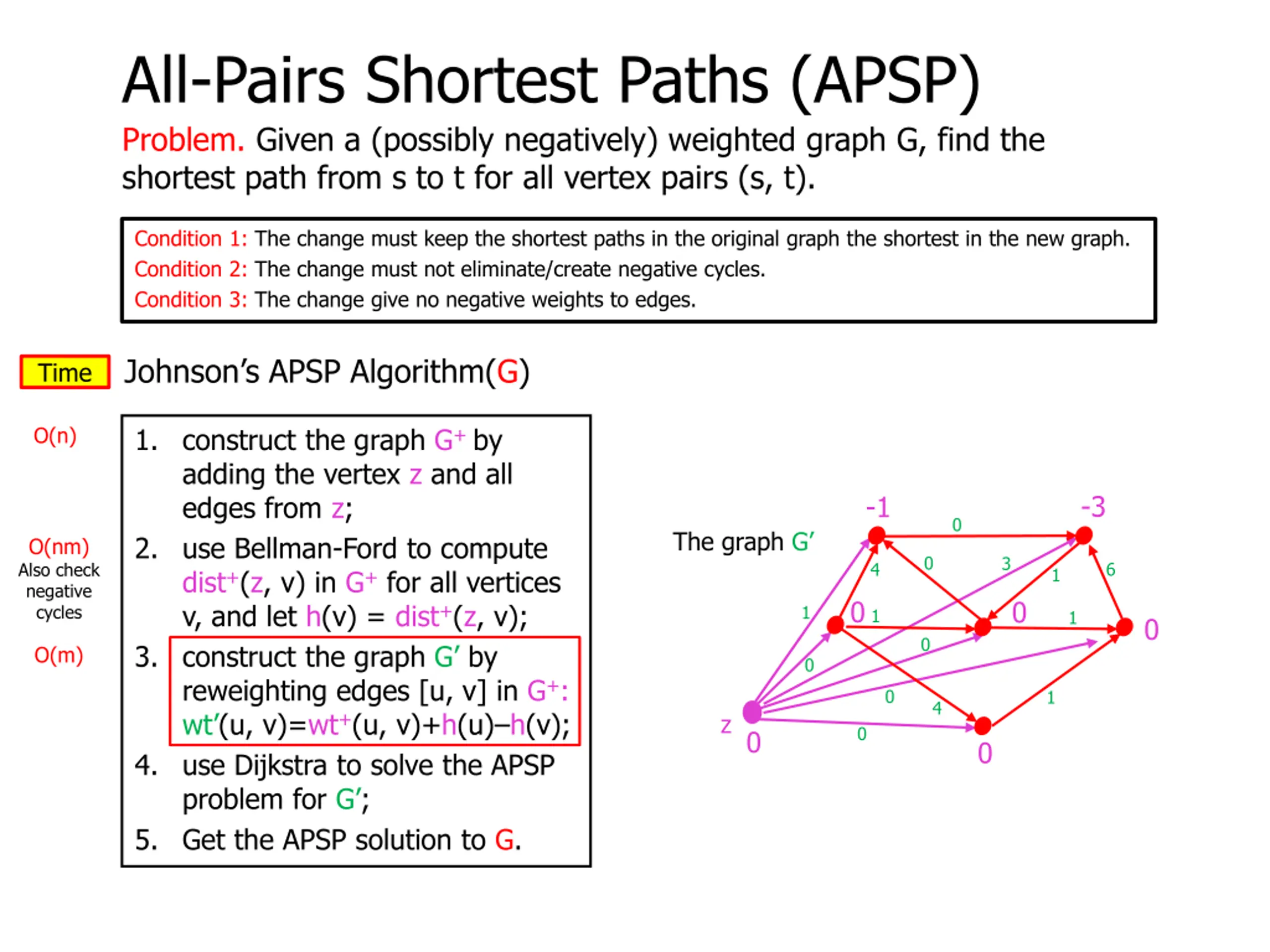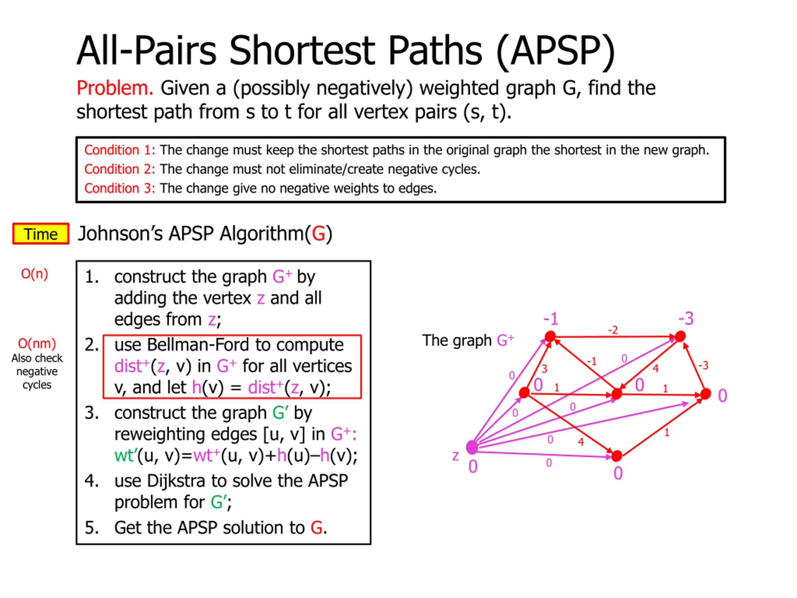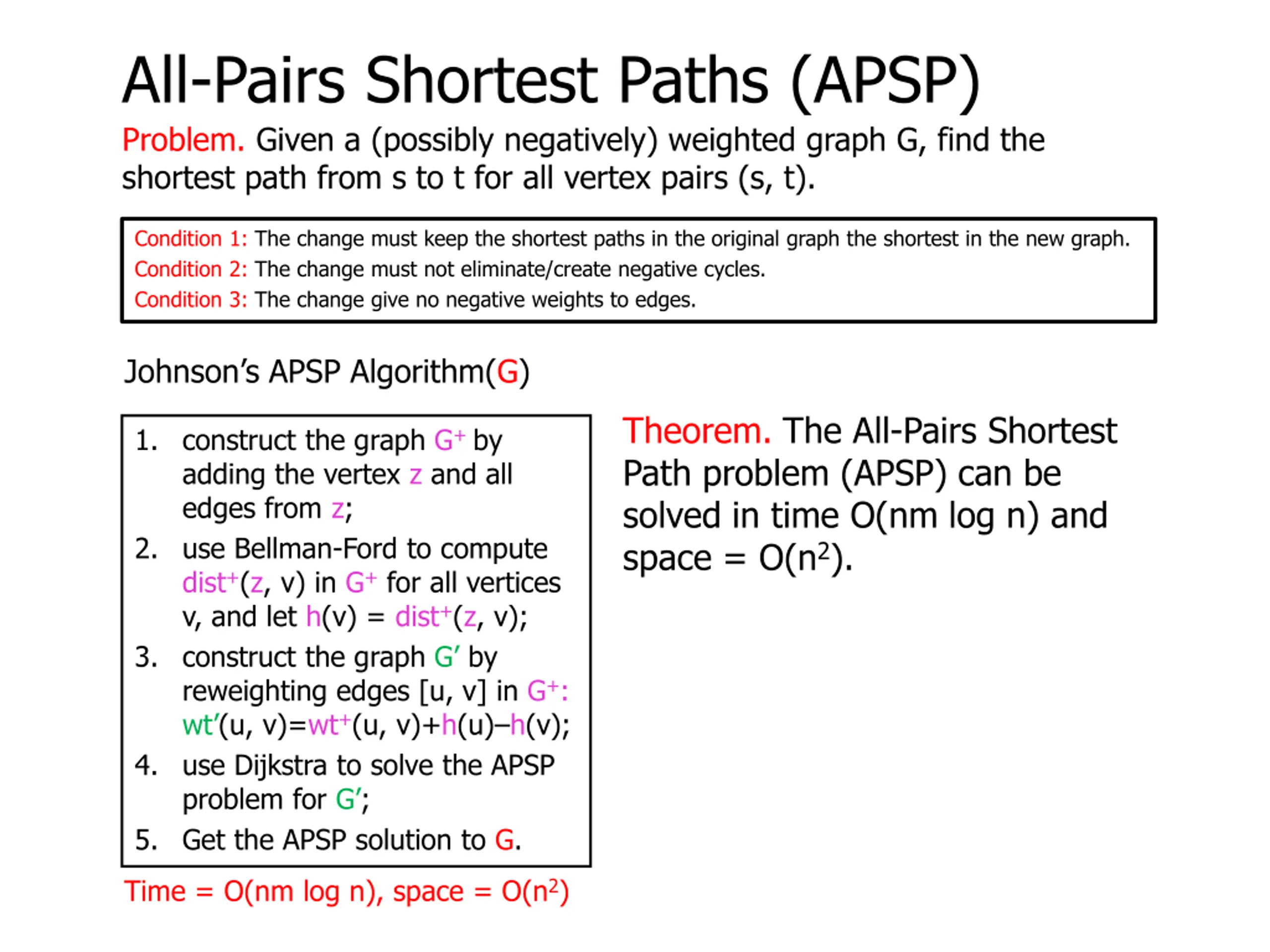 All-Pairs Shortest Paths (APSP) Problem. Given a (possibly negatively) weighted graph G, find the shortest path from s to t for all vertex pairs (s, t). Condition 1: The change must keep the shortest paths in the original graph the shortest in the new graph. Condition 2: The change must not eliminate/create negative cycles. Condition 3: The change give no negative weights to edges. Johnson s APSP Algorithm(G) Theorem. The All-Pairs Shortest Path problem (APSP) can be solved in time O(nm log n) and space = O(n2). 1. construct the graph G+ by adding the vertex z and all edges from z; 2. use Bellman-Ford to compute dist+(z, v) in G+ for all vertices v, and let h(v) = dist+(z, v); 3. construct the graph G by reweighting edges [u, v] in G+: wt (u, v)=wt+(u, v)+h(u) h(v); 4. use Dijkstra to solve the APSP problem for G ; 5. Get the APSP solution to G. Time = O(nm log n), space = O(n2)