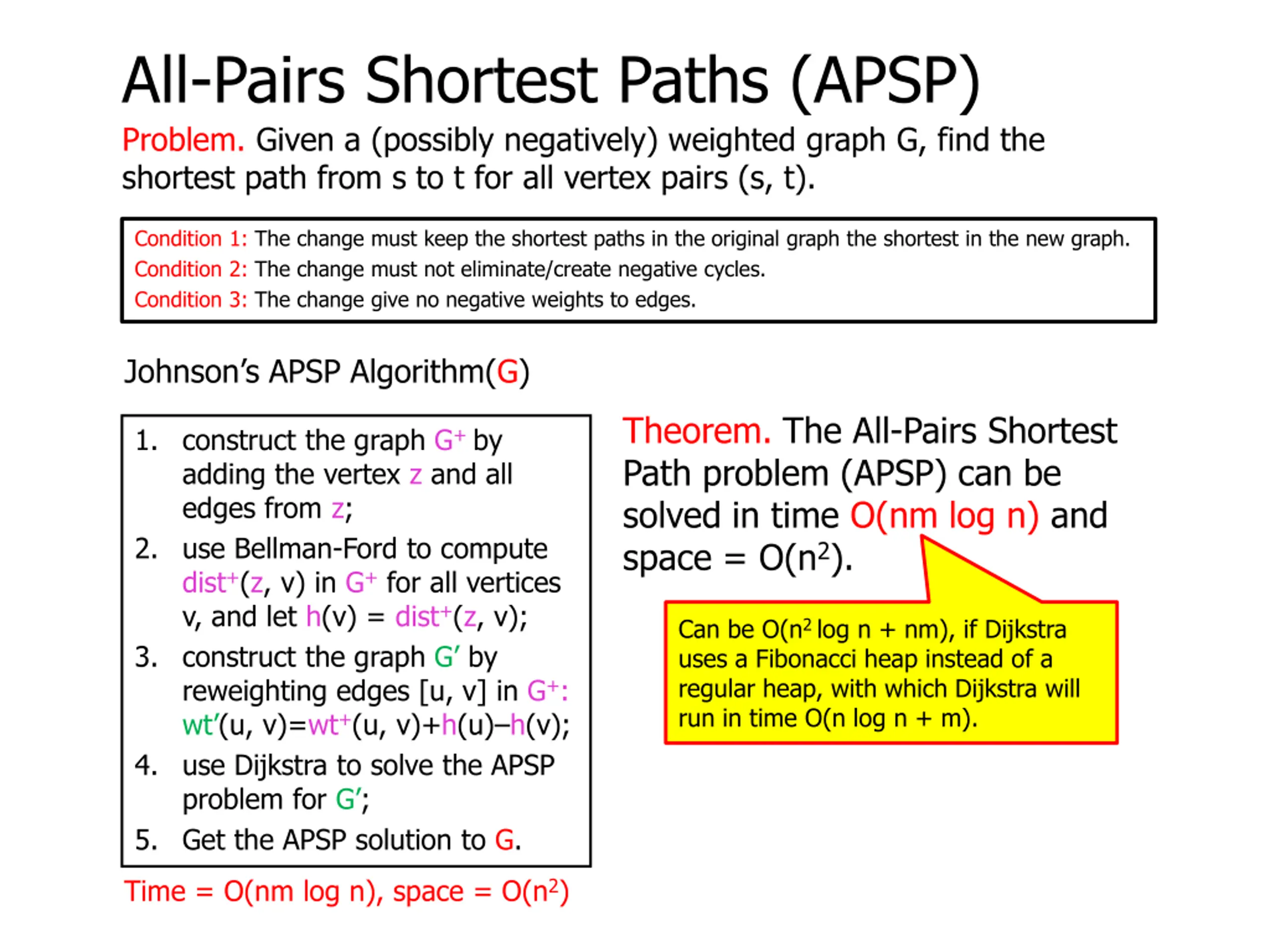 All-Pairs Shortest Paths (APSP) Problem. Given a (possibly negatively) weighted graph G, find the shortest path from s to t for all vertex pairs (s, t). Condition 1: The change must keep the shortest paths in the original graph the shortest in the new graph. Condition 2: The change must not eliminate/create negative cycles. Condition 3: The change give no negative weights to edges. Johnson s APSP Algorithm(G) Theorem. The All-Pairs Shortest Path problem (APSP) can be solved in time O(nm log n) and space = O(n2). 1. construct the graph G+ by adding the vertex z and all edges from z; 2. use Bellman-Ford to compute dist+(z, v) in G+ for all vertices v, and let h(v) = dist+(z, v); 3. construct the graph G by reweighting edges [u, v] in G+: wt (u, v)=wt+(u, v)+h(u) h(v); 4. use Dijkstra to solve the APSP problem for G ; 5. Get the APSP solution to G. Can be O(n2 log n + nm), if Dijkstra uses a Fibonacci heap instead of a regular heap, with which Dijkstra will run in time O(n log n + m). Time = O(nm log n), space = O(n2)