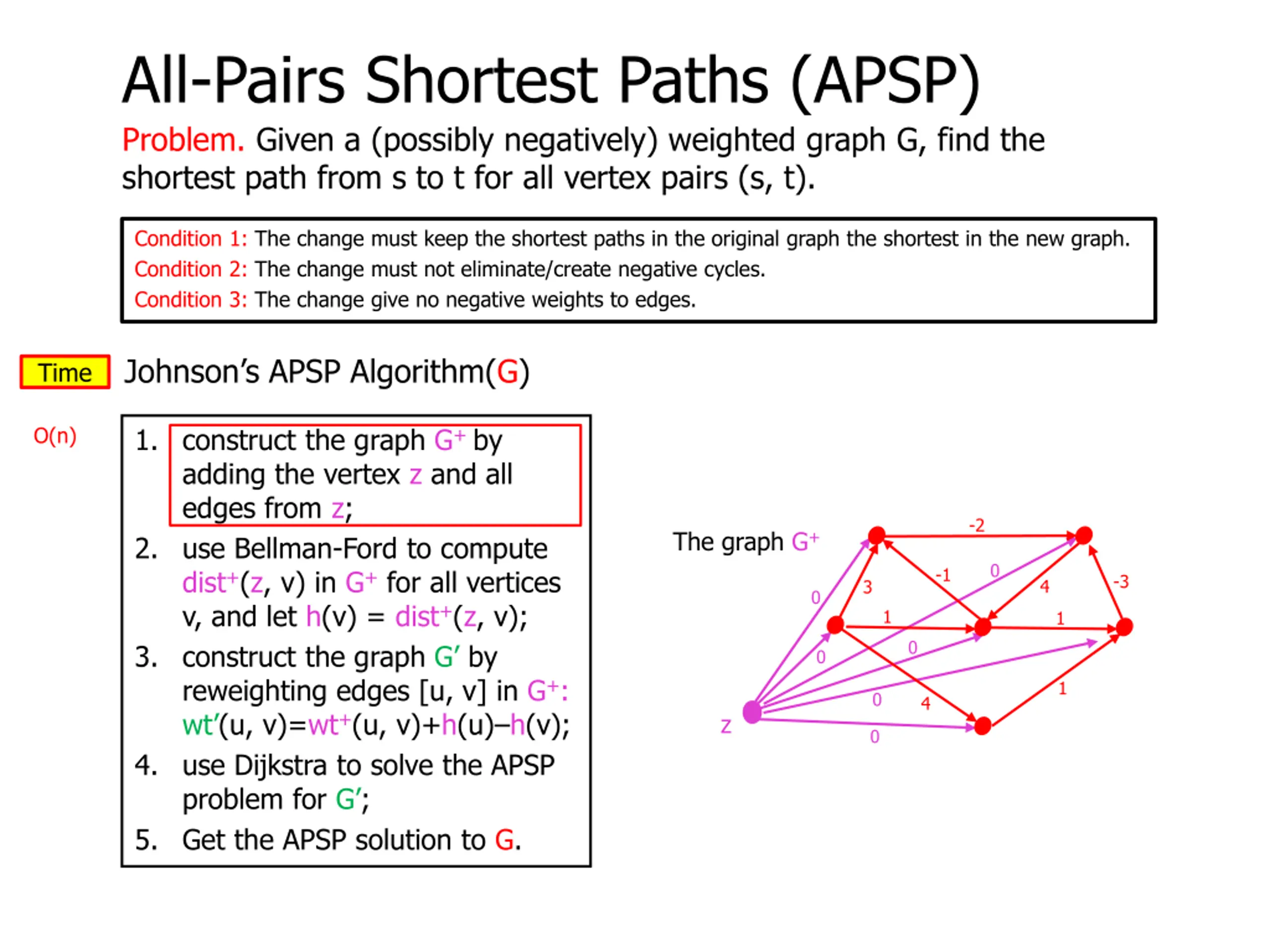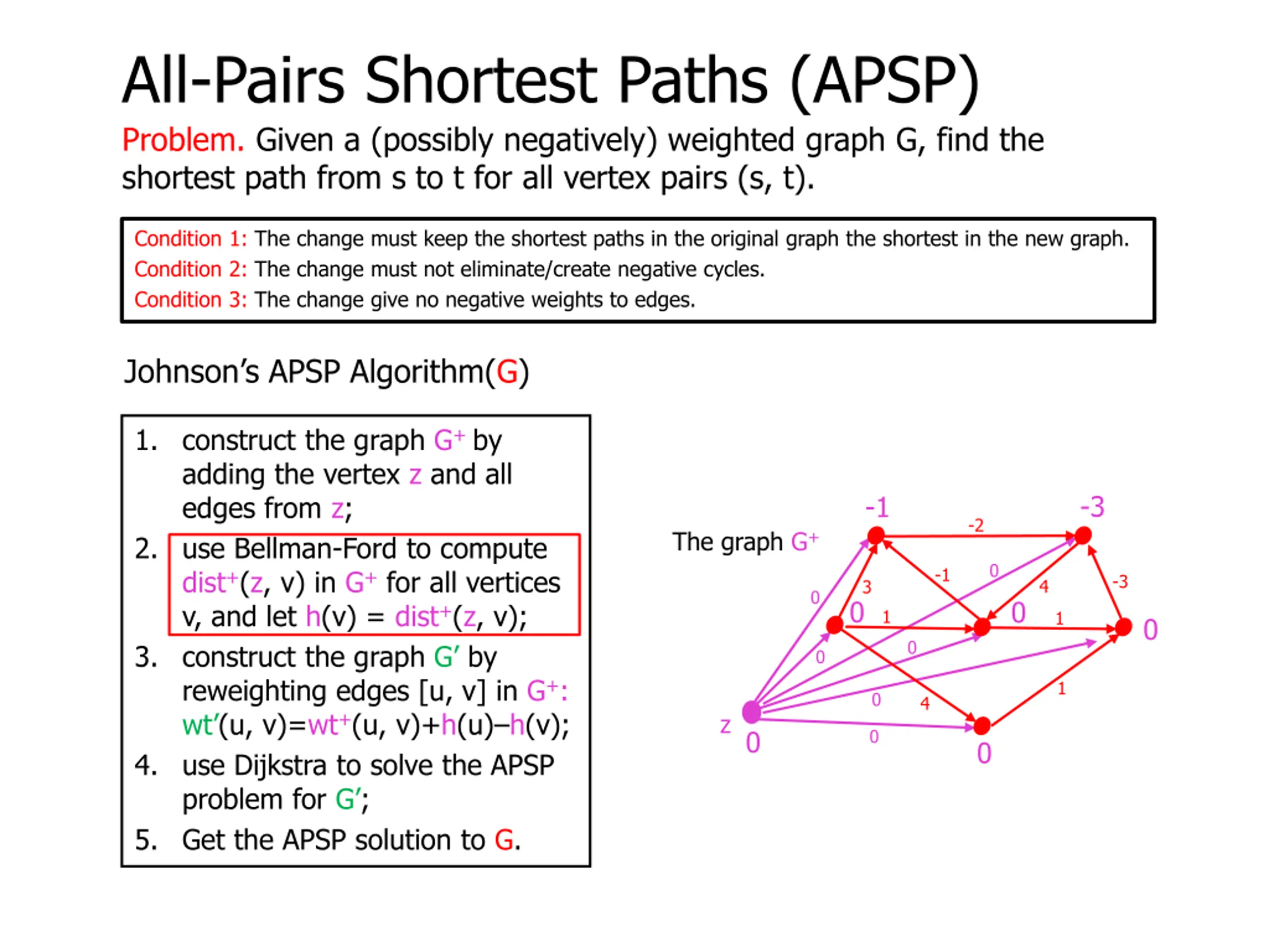 All-Pairs Shortest Paths (APSP) Problem. Given a (possibly negatively) weighted graph G, find the shortest path from s to t for all vertex pairs (s, t). Condition 1: The change must keep the shortest paths in the original graph the shortest in the new graph. Condition 2: The change must not eliminate/create negative cycles. Condition 3: The change give no negative weights to edges. Johnson s APSP Algorithm(G) 1. construct the graph G+ by adding the vertex z and all edges from z; 2. use Bellman-Ford to compute dist+(z, v) in G+ for all vertices v, and let h(v) = dist+(z, v); 3. construct the graph G by reweighting edges [u, v] in G+: wt (u, v)=wt+(u, v)+h(u) h(v); 4. use Dijkstra to solve the APSP problem for G ; 5. Get the APSP solution to G. -3 -1 -2 The graph G+ 0 -1 -3 4 3 0 0 0 1 1 0 0 0 1 0 4 z 0 0 0