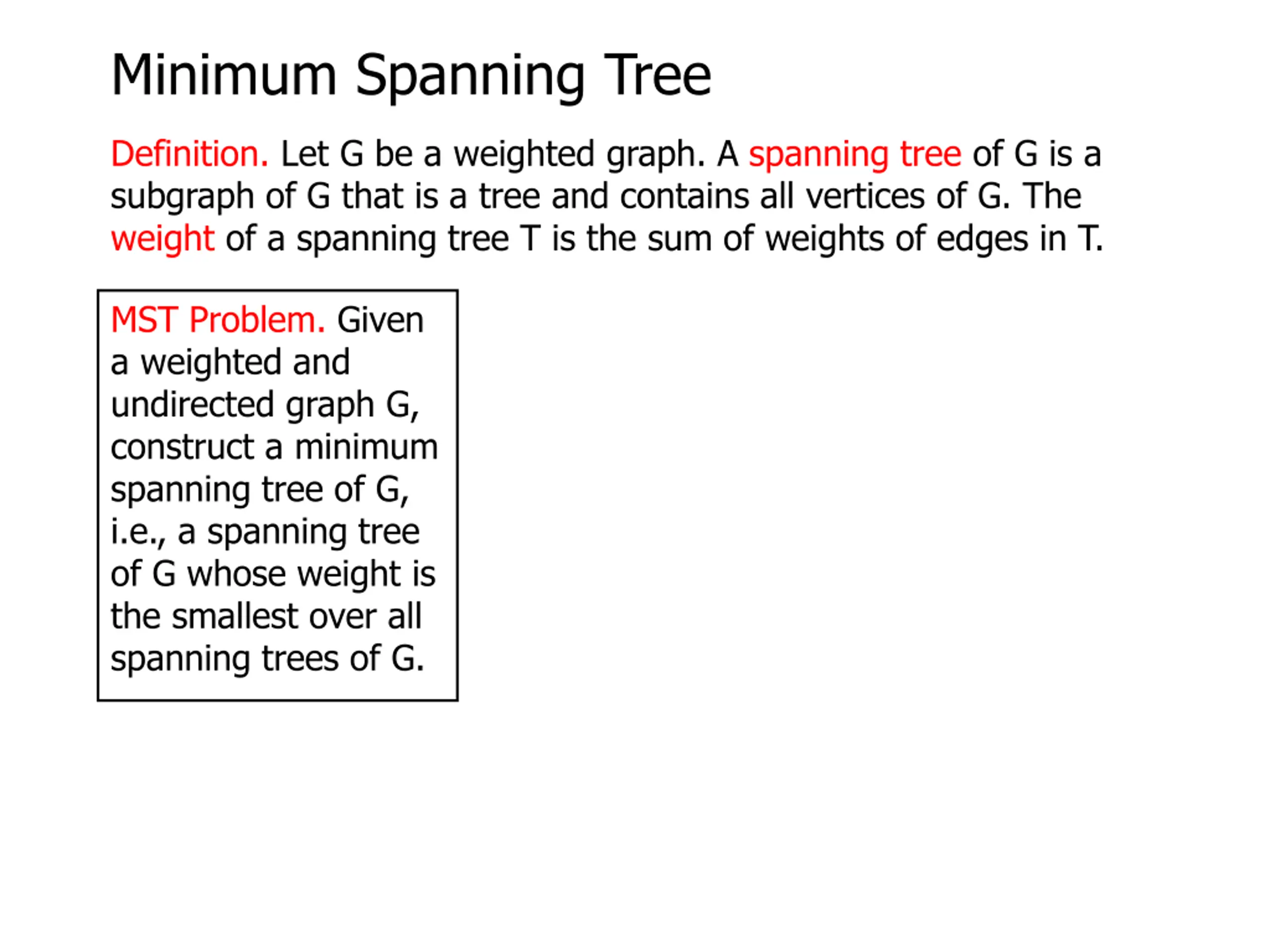 Minimum Spanning Tree Definition. Let G be a weighted graph. A spanning tree of G is a subgraph of G that is a tree and contains all vertices of G. The weight of a spanning tree T is the sum of weights of edges in T. MST Problem. Given a weighted and undirected graph G, construct a minimum spanning tree of G, i.e., a spanning tree of G whose weight is the smallest over all spanning trees of G.