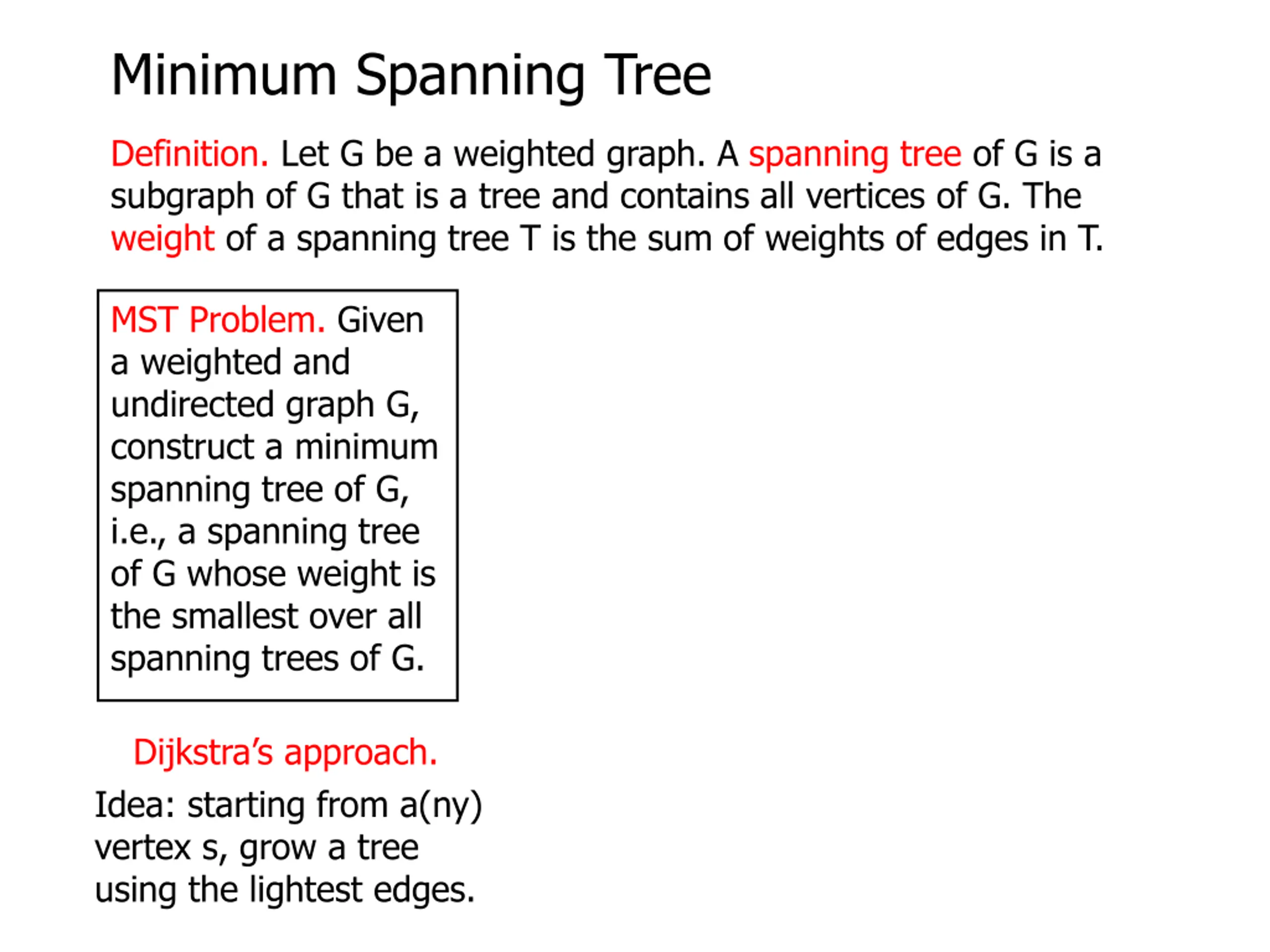 Minimum Spanning Tree Definition. Let G be a weighted graph. A spanning tree of G is a subgraph of G that is a tree and contains all vertices of G. The weight of a spanning tree T is the sum of weights of edges in T. MST Problem. Given a weighted and undirected graph G, construct a minimum spanning tree of G, i.e., a spanning tree of G whose weight is the smallest over all spanning trees of G. Dijkstra s approach. Idea: starting from a(ny) vertex s, grow a tree using the lightest edges.