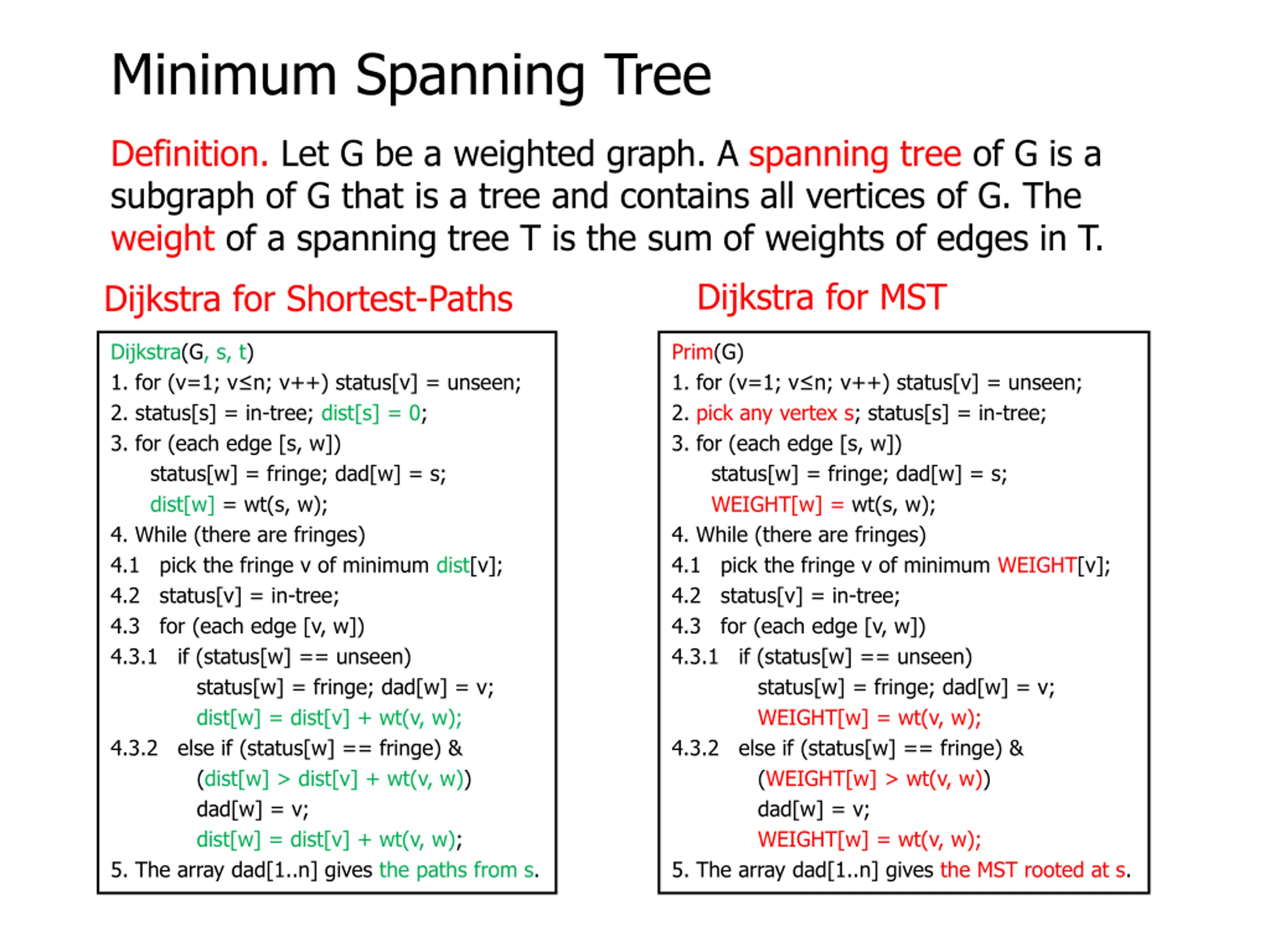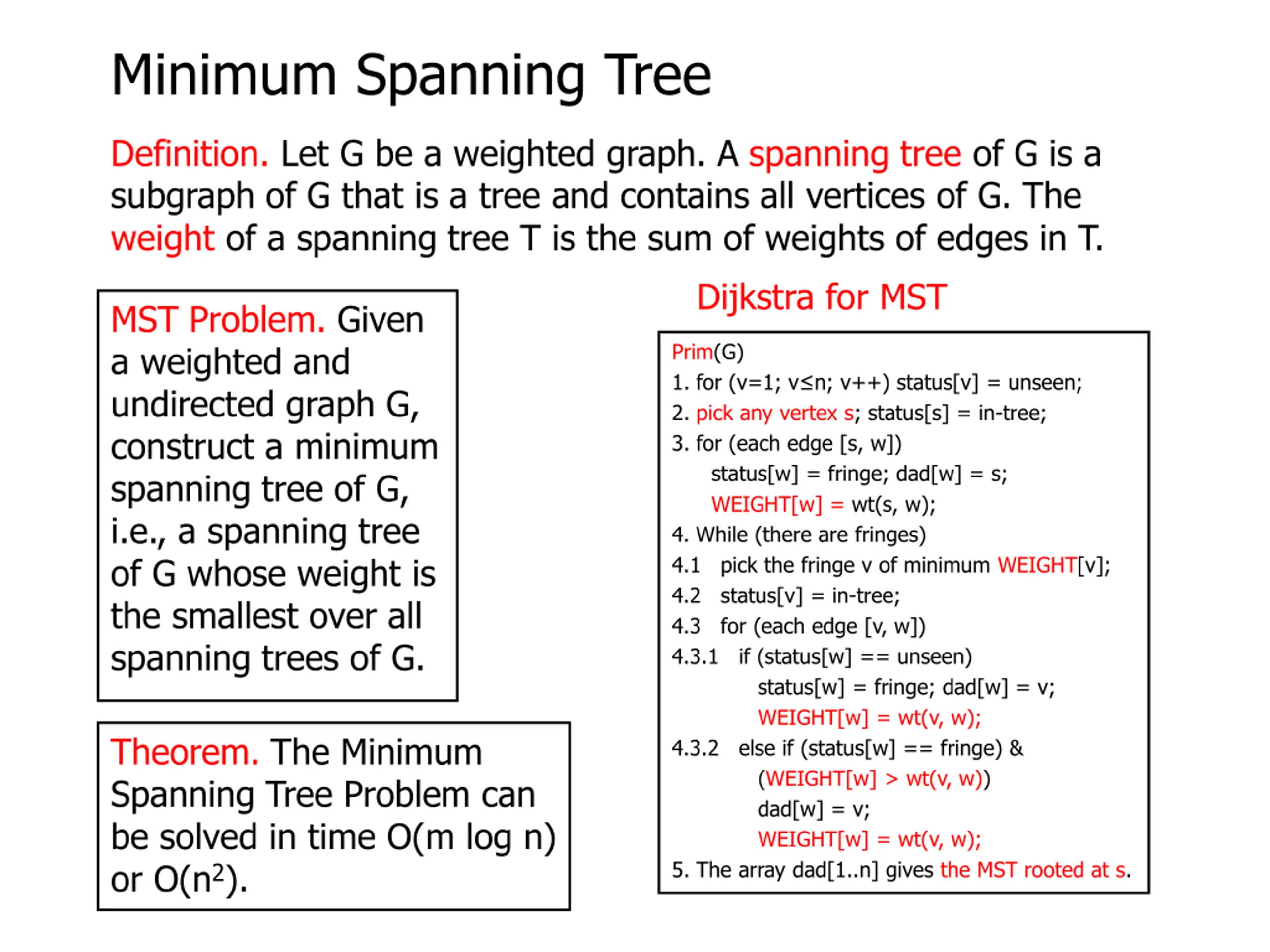 Minimum Spanning Tree Definition. Let G be a weighted graph. A spanning tree of G is a subgraph of G that is a tree and contains all vertices of G. The weight of a spanning tree T is the sum of weights of edges in T. Dijkstra for MST MST Problem. Given a weighted and undirected graph G, construct a minimum spanning tree of G, i.e., a spanning tree of G whose weight is the smallest over all spanning trees of G. Prim(G) 1. for (v=1; v n; v++) status[v] = unseen; 2. pick any vertex s; status[s] = in-tree; 3. for (each edge [s, w]) status[w] = fringe; dad[w] = s; WEIGHT[w] = wt(s, w); 4. While (there are fringes) 4.1 pick the fringe v of minimum WEIGHT[v]; 4.2 status[v] = in-tree; 4.3 for (each edge [v, w]) 4.3.1 if (status[w] == unseen) status[w] = fringe; dad[w] = v; WEIGHT[w] = wt(v, w); 4.3.2 else if (status[w] == fringe) & (WEIGHT[w] > wt(v, w)) dad[w] = v; WEIGHT[w] = wt(v, w); 5. The array dad[1..n] gives the MST rooted at s. Theorem. The Minimum Spanning Tree Problem can be solved in time O(m log n) or O(n2).
