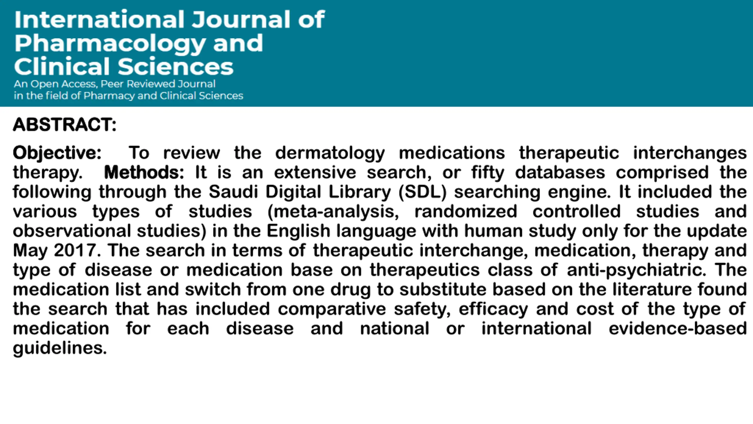 ABSTRACT ABSTRACT: : Objective Objective: : therapy. following through the Saudi Digital Library (SDL) searching engine. It included the various types of studies (meta-analysis, randomized controlled studies and observational studies) in the English language with human study only for the update May 2017. The search in terms of therapeutic interchange, medication, therapy and type of disease or medication base on therapeutics class of anti-psychiatric. The medication list and switch from one drug to substitute based on the literature found the search that has included comparative safety, efficacy and cost of the type of medication for each disease and national guidelines. To review the dermatology medications therapeutic interchanges Methods Methods: : It is an extensive search, or fifty databases comprised the or international evidence-based