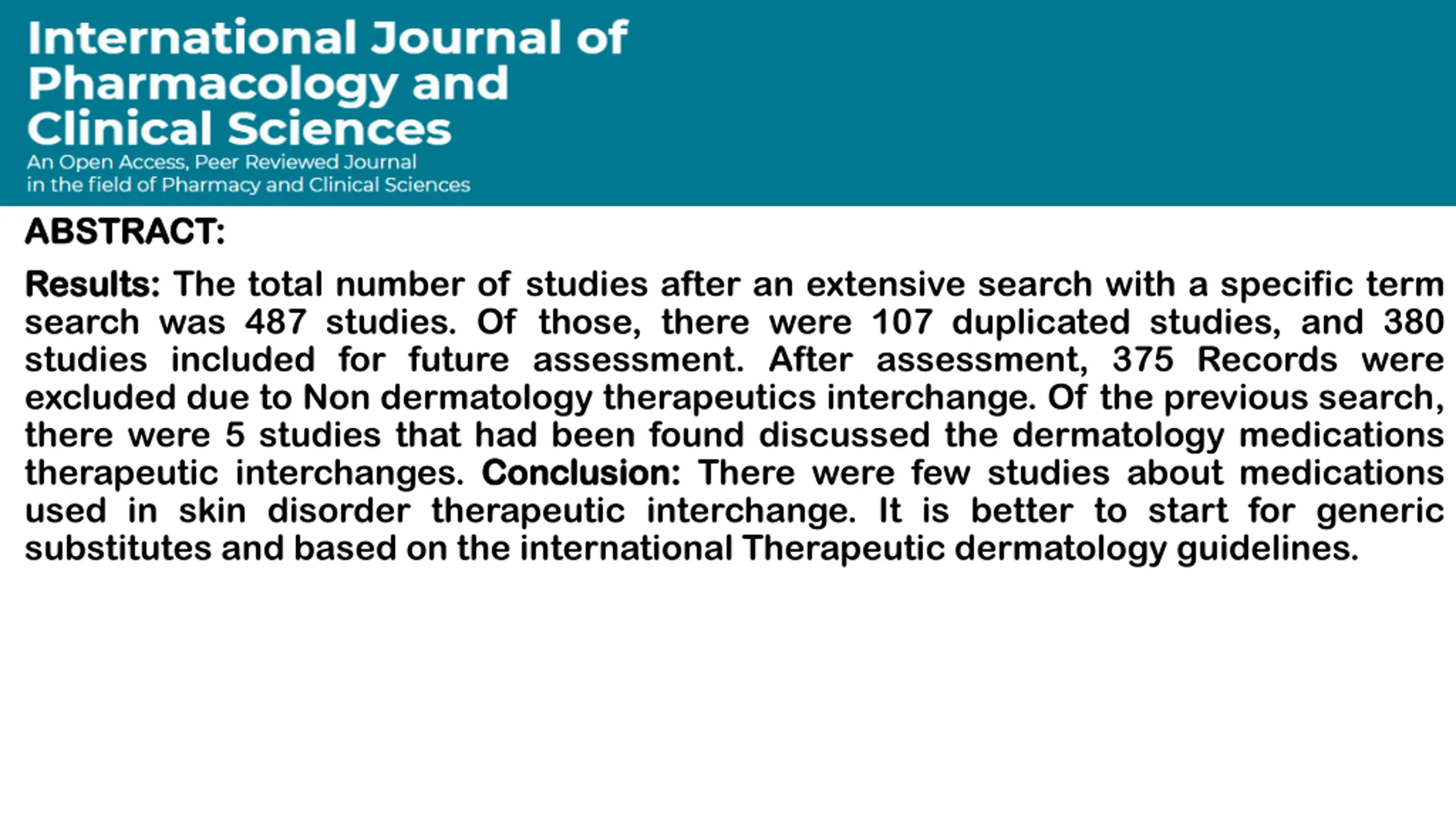 ABSTRACT: ABSTRACT: Results Results: : The total number of studies after an extensive search with a specific term search was 487 studies. Of those, there were 107 duplicated studies, and 380 studies included for future assessment. After assessment, 375 Records were excluded due to Non dermatology therapeutics interchange. Of the previous search, there were 5 studies that had been found discussed the dermatology medications therapeutic interchanges. Conclusion Conclusion: : There were few studies about medications used in skin disorder therapeutic interchange. It is better to start for generic substitutes and based on the international Therapeutic dermatology guidelines.