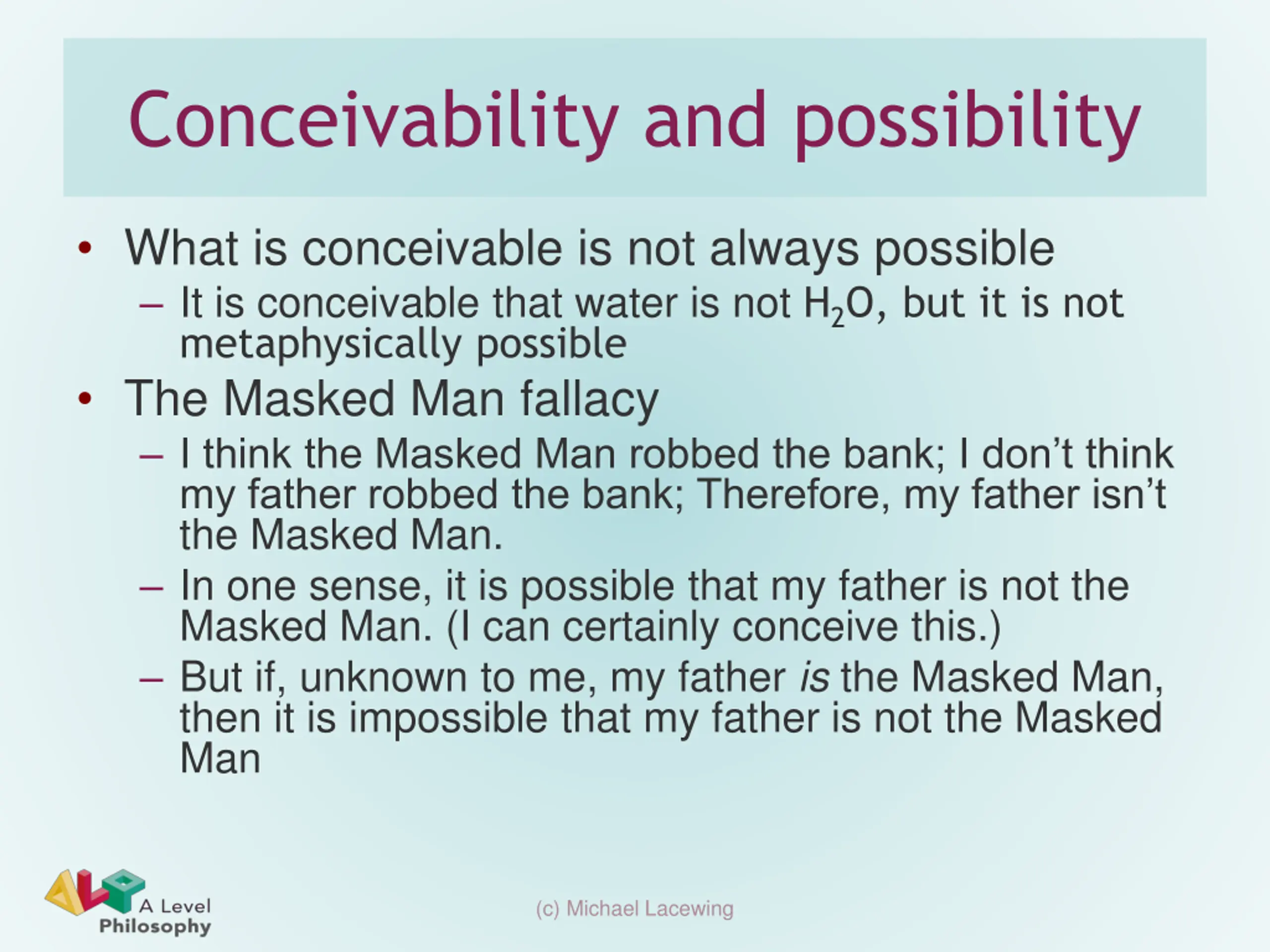 Conceivability and possibility What is conceivable is not always possible It is conceivable that water is not H2O, but it is not metaphysically possible The Masked Man fallacy I think the Masked Man robbed the bank; I don t think my father robbed the bank; Therefore, my father isn t the Masked Man. In one sense, it is possible that my father is not the Masked Man. (I can certainly conceive this.) But if, unknown to me, my father is the Masked Man, then it is impossible that my father is not the Masked Man (c) Michael Lacewing