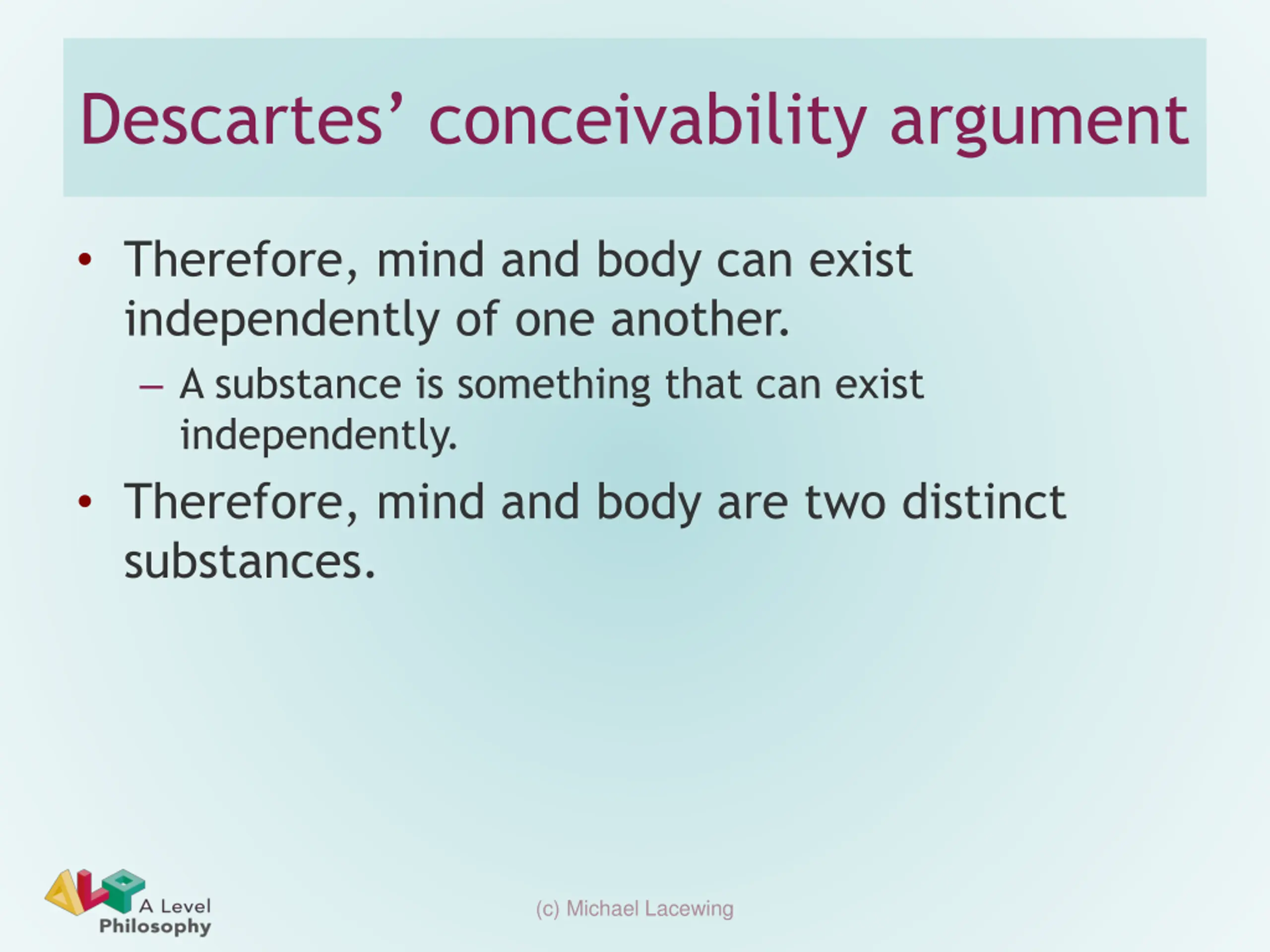 Descartes conceivability argument Therefore, mind and body can exist independently of one another. A substance is something that can exist independently. Therefore, mind and body are two distinct substances. (c) Michael Lacewing