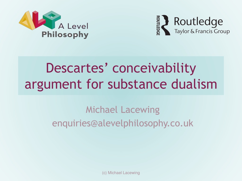 Descartes conceivability argument for substance dualism Michael Lacewing enquiries@alevelphilosophy.co.uk (c) Michael Lacewing