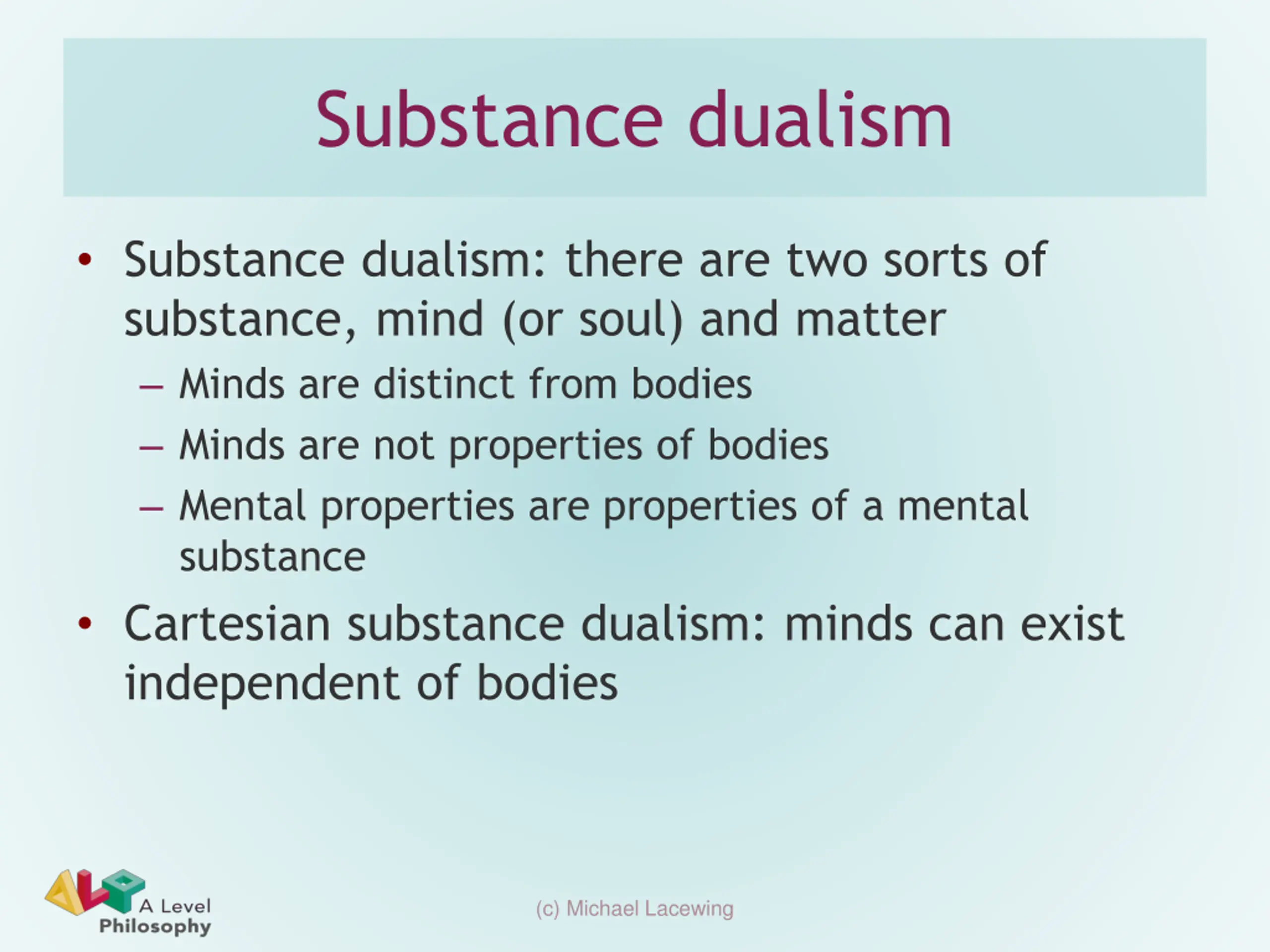 Substance dualism Substance dualism: there are two sorts of substance, mind (or soul) and matter Minds are distinct from bodies Minds are not properties of bodies Mental properties are properties of a mental substance Cartesian substance dualism: minds can exist independent of bodies (c) Michael Lacewing