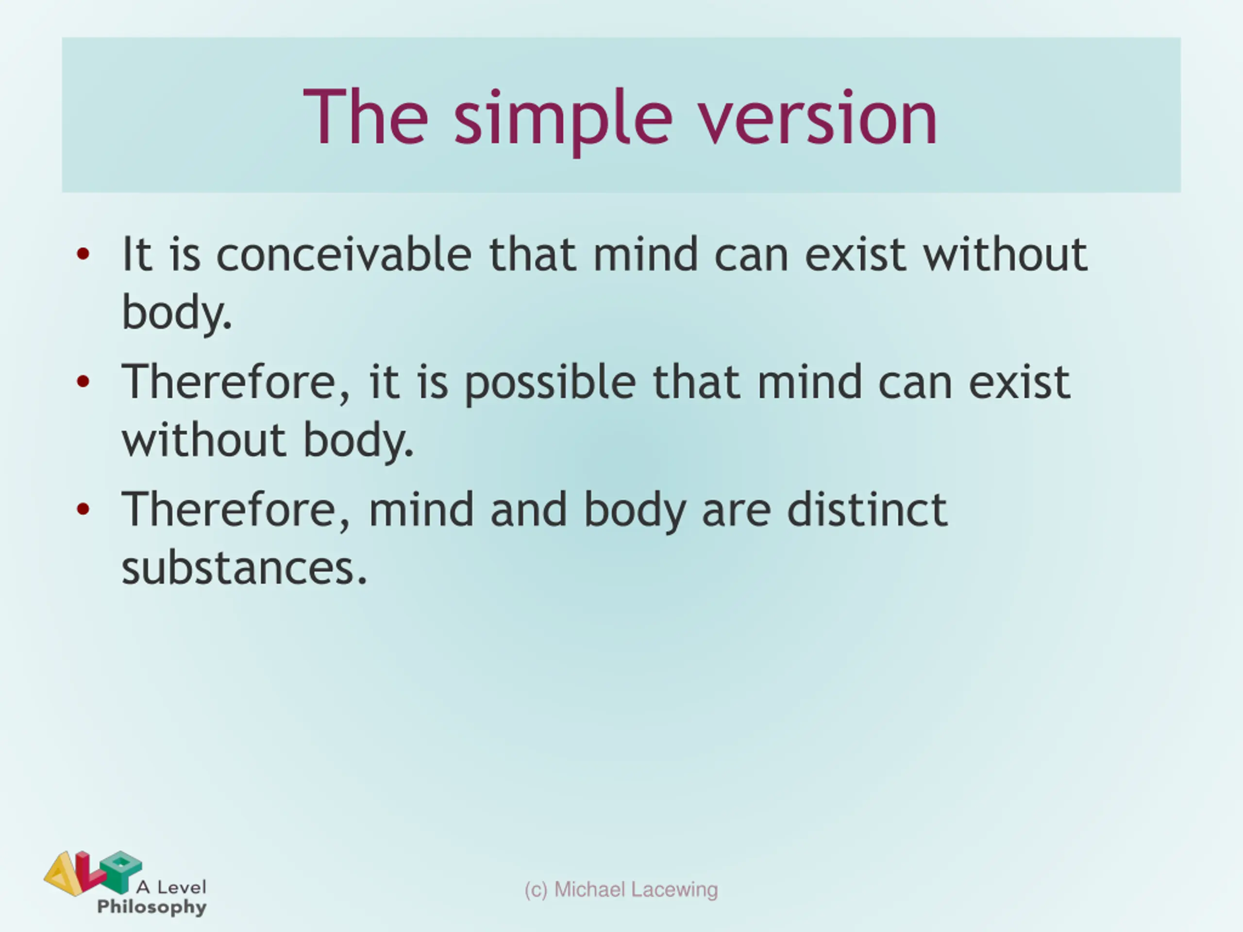 The simple version It is conceivable that mind can exist without body. Therefore, it is possible that mind can exist without body. Therefore, mind and body are distinct substances. (c) Michael Lacewing