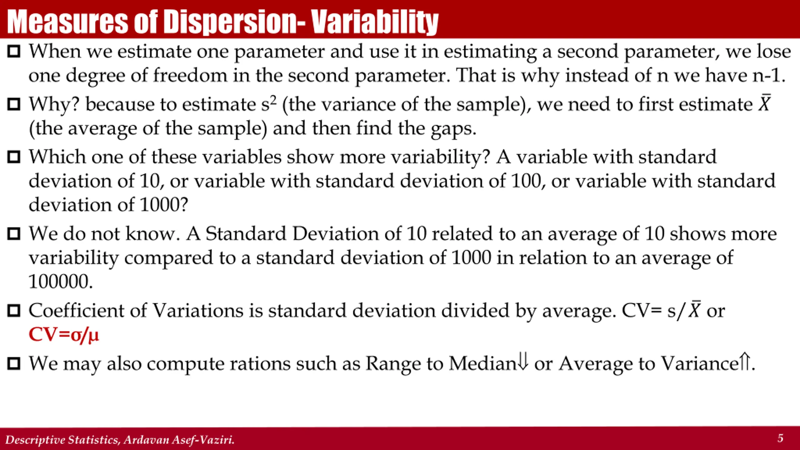 Measures of Dispersion- Variability When we estimate one parameter and use it in estimating a second parameter, we lose one degree of freedom in the second parameter. That is why instead of n we have n-1. Why? because to estimate s2 (the variance of the sample), we need to first estimate ? (the average of the sample) and then find the gaps. Which one of these variables show more variability? A variable with standard deviation of 10, or variable with standard deviation of 100, or variable with standard deviation of 1000? We do not know. A Standard Deviation of 10 related to an average of 10 shows more variability compared to a standard deviation of 1000 in relation to an average of 100000. Coefficient of Variations is standard deviation divided by average. CV= s/ ? or CV= / We may also compute rations such as Range to Median or Average to Variance . 5 Descriptive Statistics, Ardavan Asef-Vaziri.