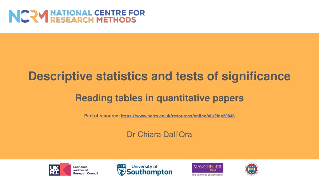 Descriptive statistics and tests of significance Reading tables in quantitative papers Part of resource: https://www.ncrm.ac.uk/resources/online/all/?id=20846 Dr Chiara Dall Ora