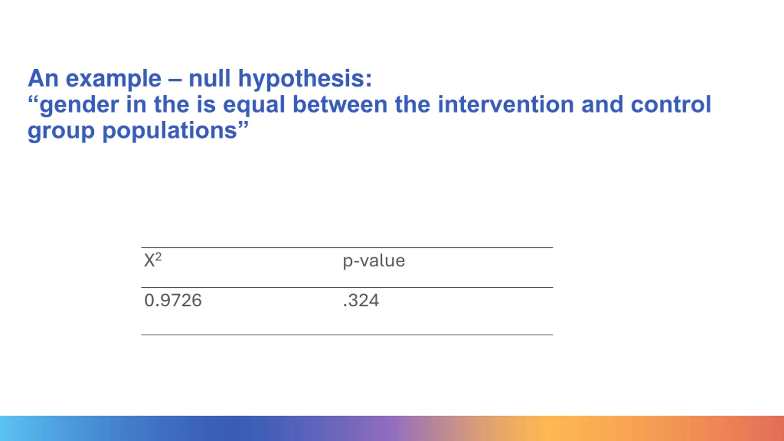 An example null hypothesis: gender in the is equal between the intervention and control group populations 2 p-value 0.9726 .324