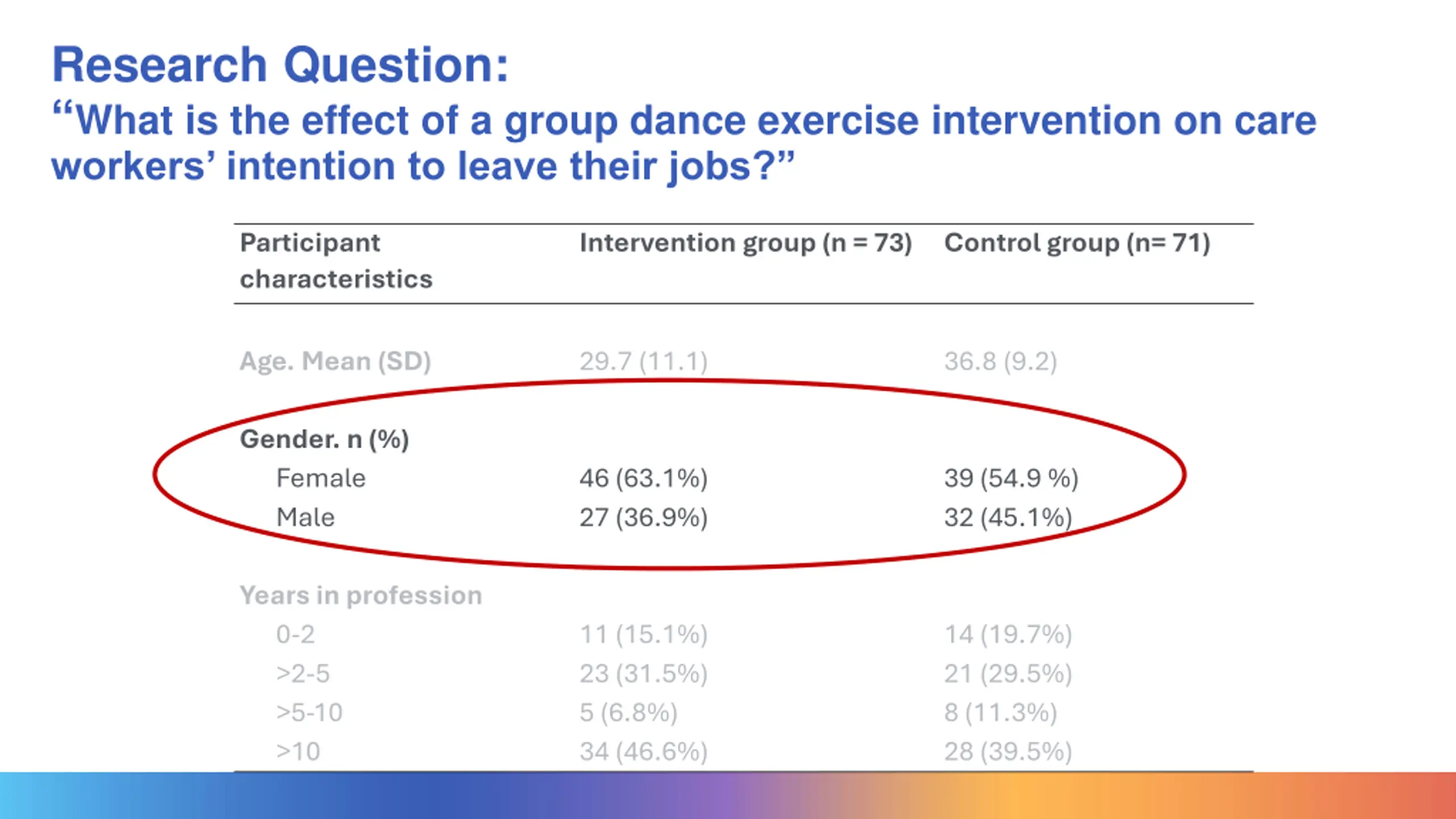 An example Research Question: What is the effect of a group dance exercise intervention on care workers intention to leave their jobs? Participant characteristics Intervention group (n = 73) Control group (n= 71) Age. Mean (SD) 29.7 (11.1) 36.8 (9.2) Gender. n (%) Female Male 46 (63.1%) 27 (36.9%) 39 (54.9 %) 32 (45.1%) Years in profession 0-2 >2-5 >5-10 >10 11 (15.1%) 23 (31.5%) 5 (6.8%) 34 (46.6%) 14 (19.7%) 21 (29.5%) 8 (11.3%) 28 (39.5%)