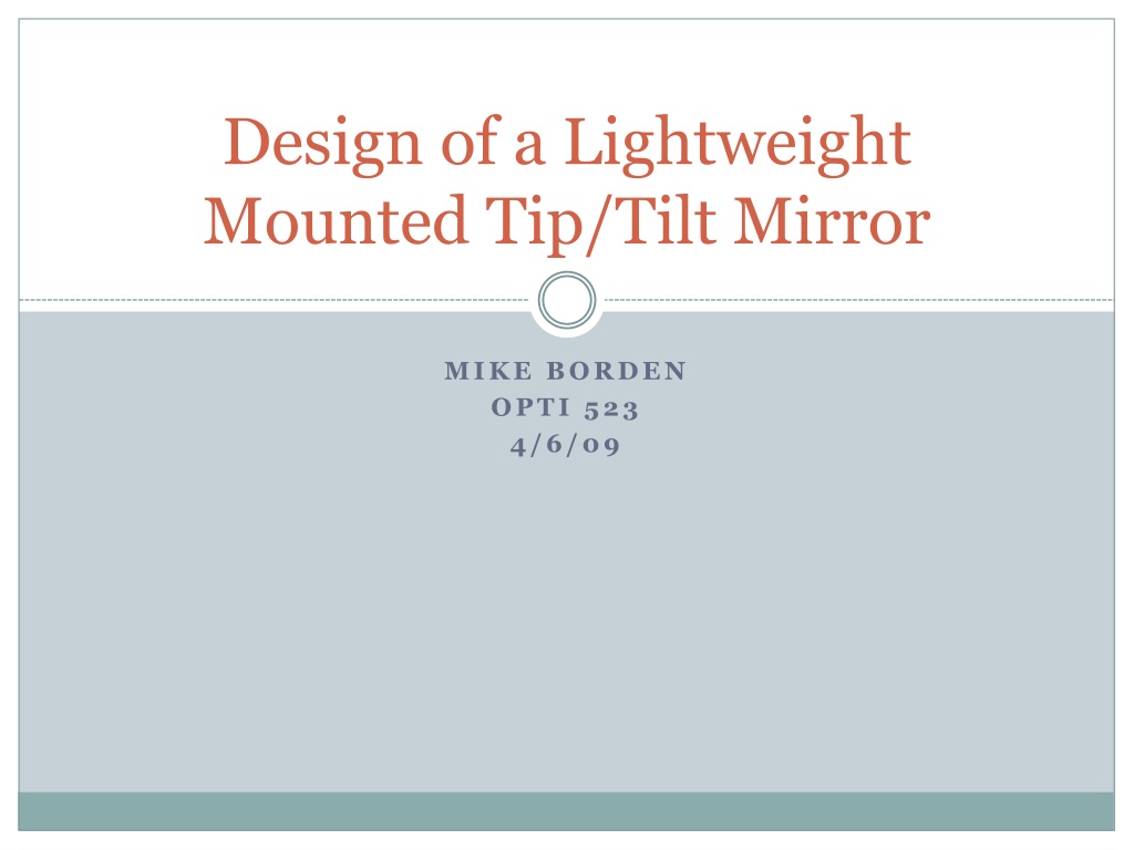 This document presents the design considerations for a lightweight mounted tip/tilt mirror by Mike Borden. It outlines various design problems, materials, and manufacturing considerations such as stiffness-to-weight ratios and thermal stresses. The analysis includes a comparison of materials like ULE, Zerodur, and aluminum, and discusses optimal optical specifications, including surface roughness and error budgets for mirror performance.