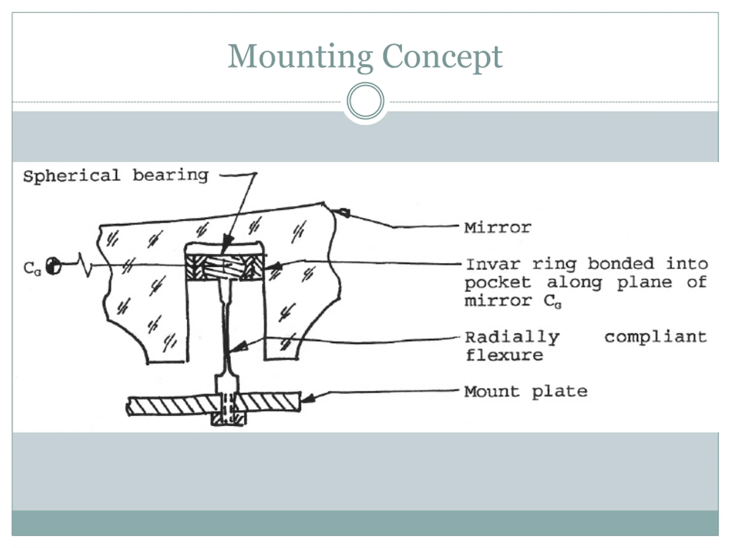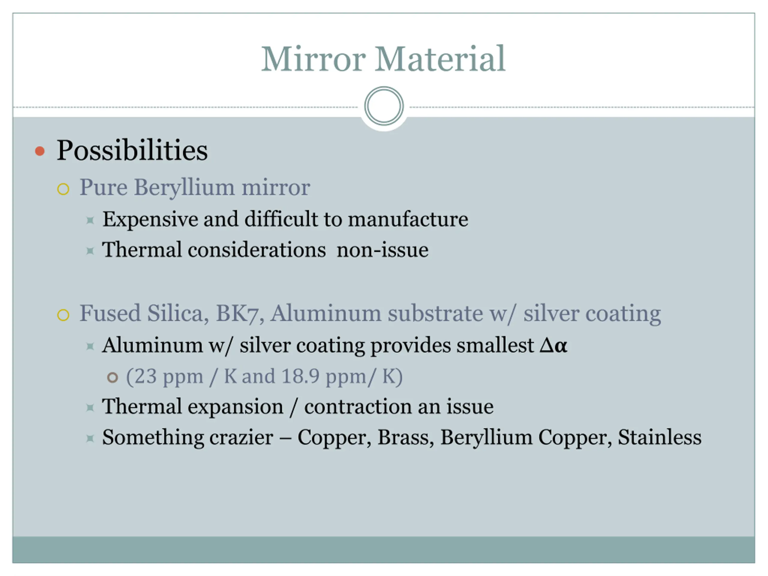 Mirror Material Possibilities Pure Beryllium mirror Expensive and difficult to manufacture Thermal considerations non-issue Fused Silica, BK7, Aluminum substrate w/ silver coating Aluminum w/ silver coating provides smallest ? (23 ppm / K and 18.9 ppm/ K) Thermal expansion / contraction an issue Something crazier Copper, Brass, Beryllium Copper, Stainless