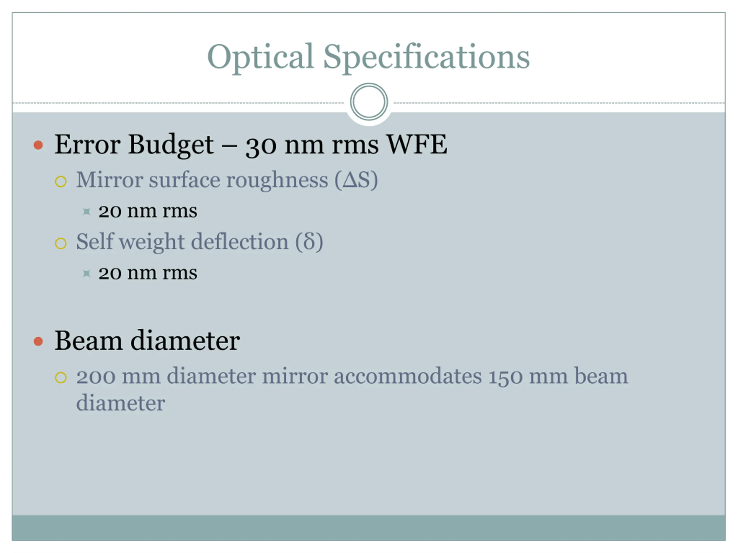 Optical Specifications Error Budget 30 nm rms WFE Mirror surface roughness ( S) 20 nm rms Self weight deflection ( ) 20 nm rms Beam diameter 200 mm diameter mirror accommodates 150 mm beam diameter