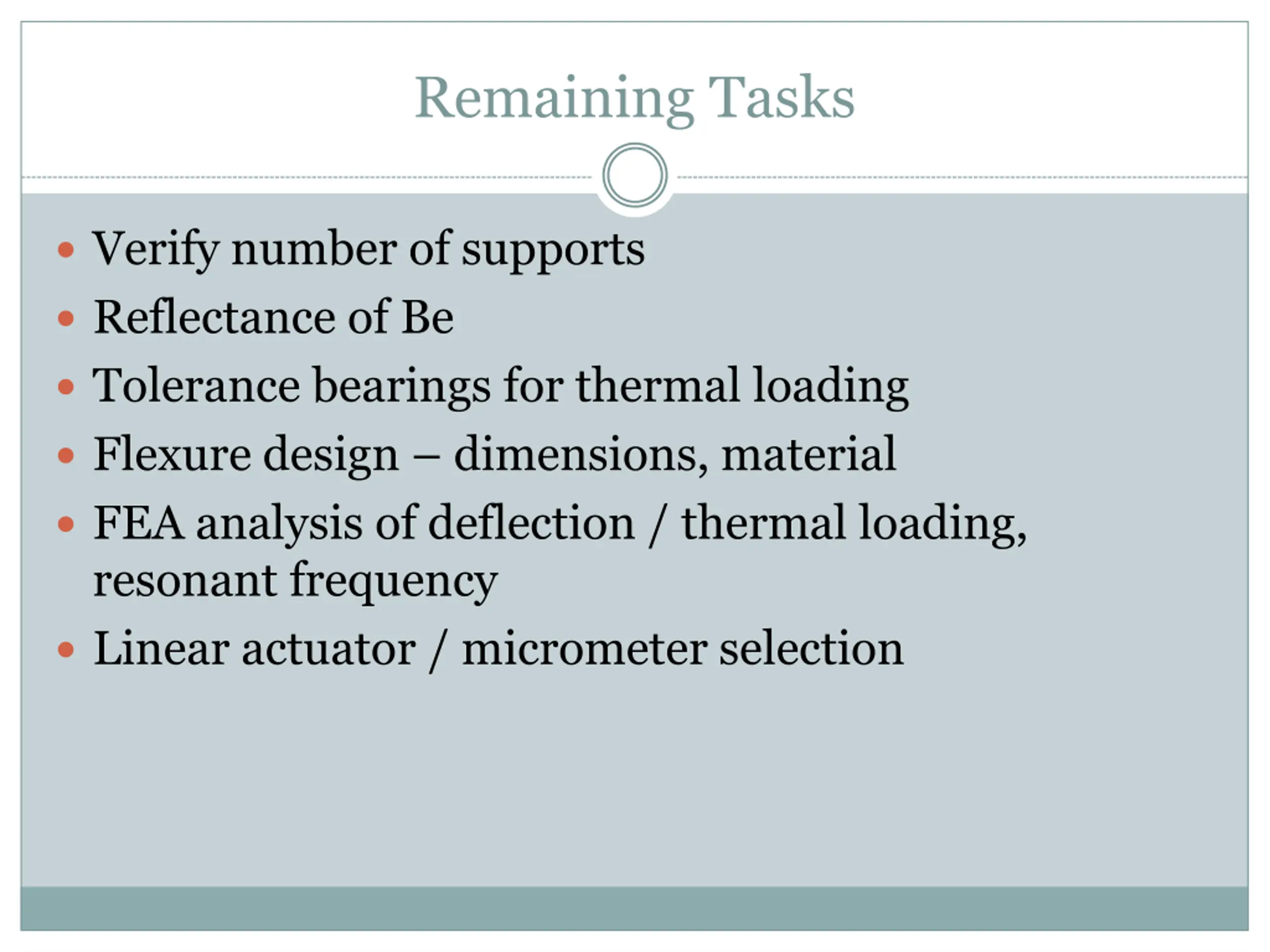 Remaining Tasks Verify number of supports Reflectance of Be Tolerance bearings for thermal loading Flexure design dimensions, material FEA analysis of deflection / thermal loading, resonant frequency Linear actuator / micrometer selection