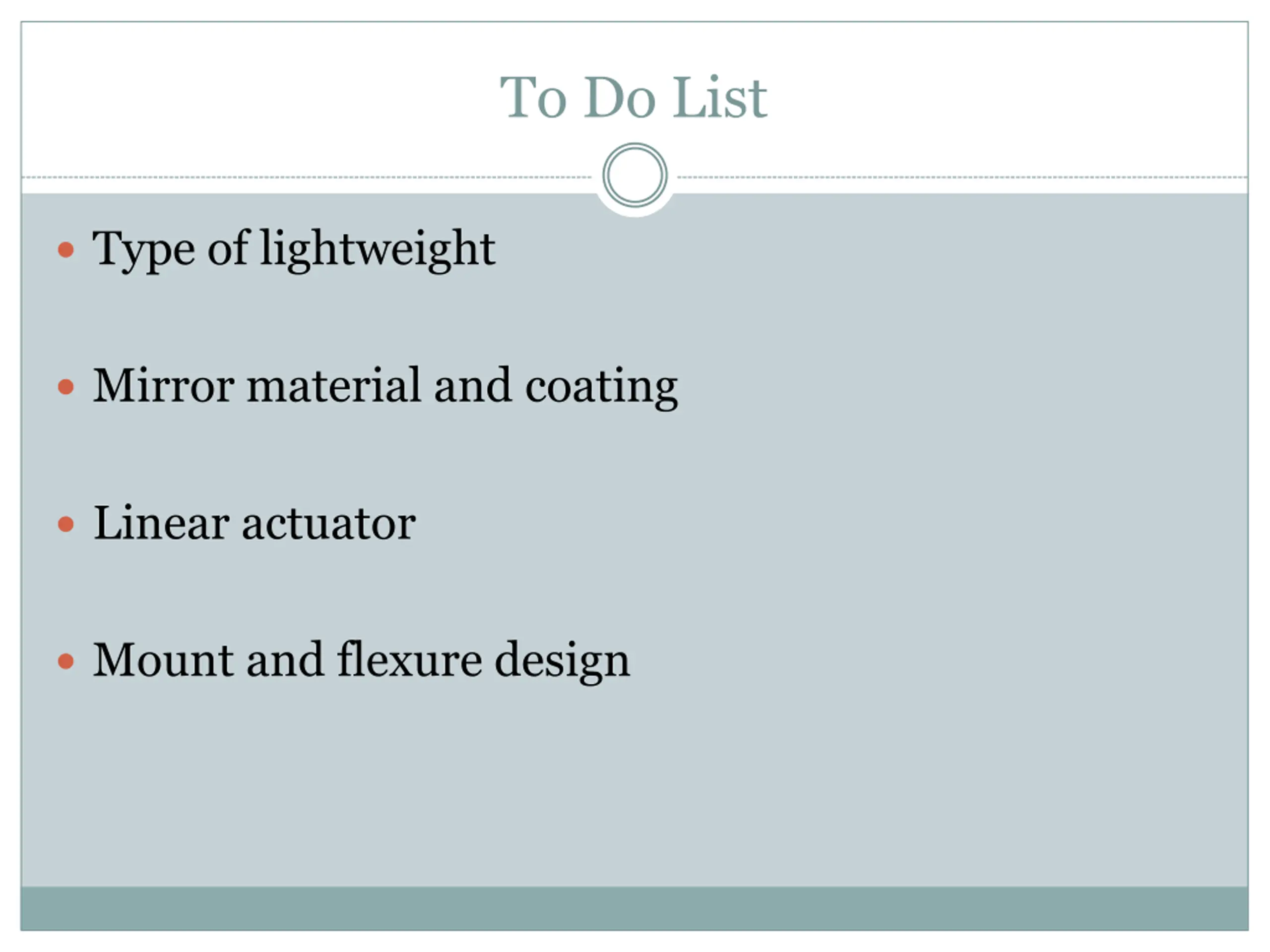 To Do List Type of lightweight Mirror material and coating Linear actuator Mount and flexure design