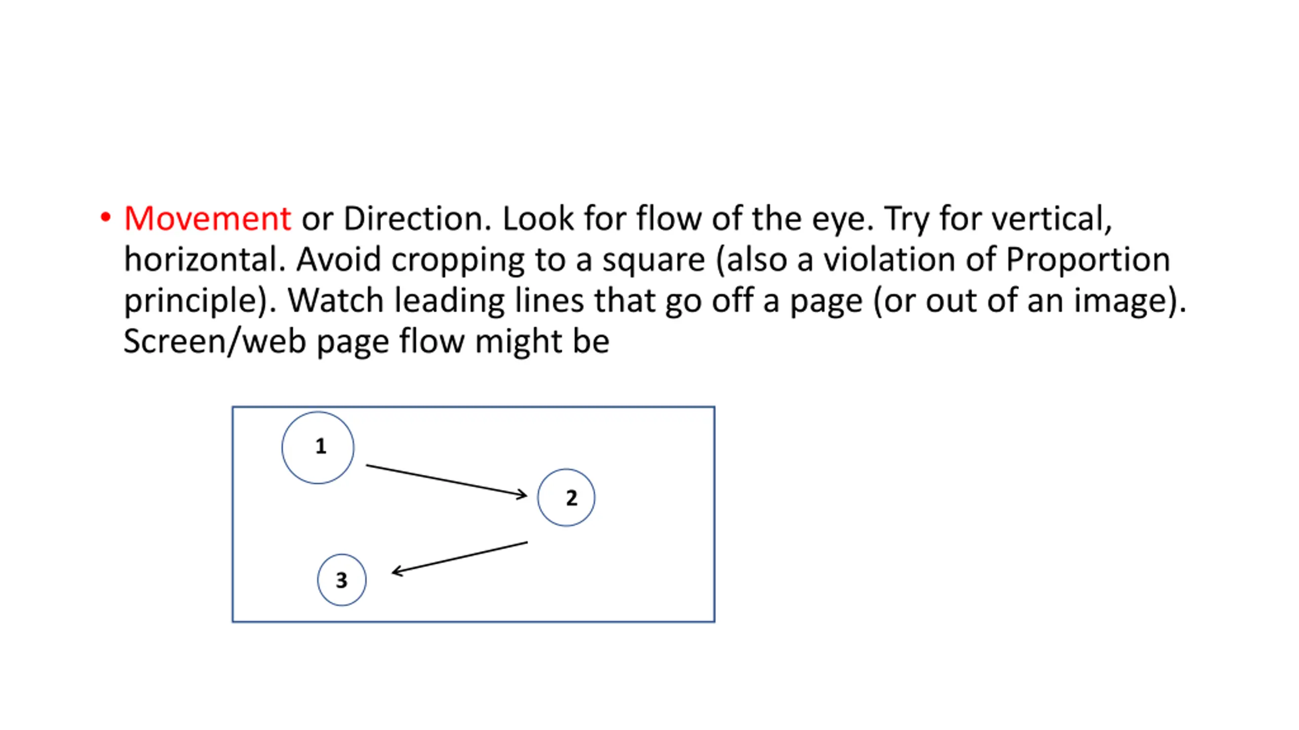 Movement or Direction. Look for flow of the eye. Try for vertical, horizontal. Avoid cropping to a square (also a violation of Proportion principle). Watch leading lines that go off a page (or out of an image). Screen/web page flow might be 1 2 3