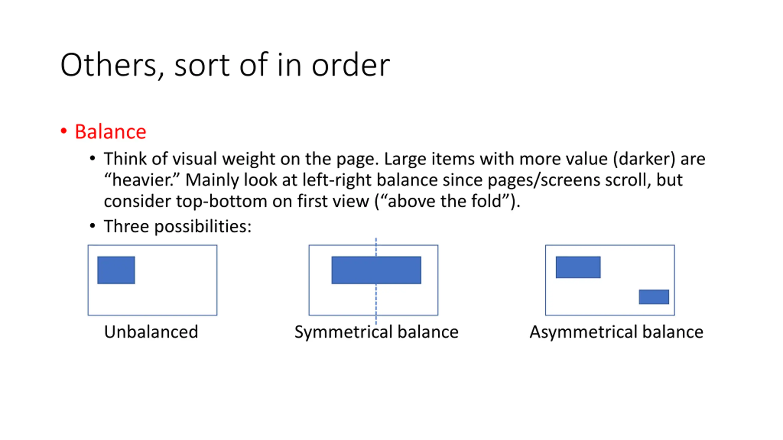 Others, sort of in order Balance Think of visual weight on the page. Large items with more value (darker) are heavier. Mainly look at left-right balance since pages/screens scroll, but consider top-bottom on first view ( above the fold ). Three possibilities: Unbalanced Symmetrical balance Asymmetrical balance