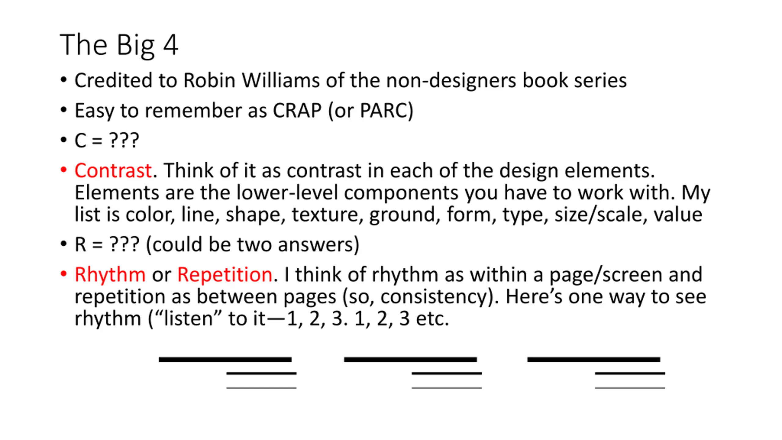 The Big 4 Credited to Robin Williams of the non-designers book series Easy to remember as CRAP (or PARC) C = ??? Contrast. Think of it as contrast in each of the design elements. Elements are the lower-level components you have to work with. My list is color, line, shape, texture, ground, form, type, size/scale, value R = ??? (could be two answers) Rhythm or Repetition. I think of rhythm as within a page/screen and repetition as between pages (so, consistency). Here s one way to see rhythm ( listen to it 1, 2, 3. 1, 2, 3 etc.
