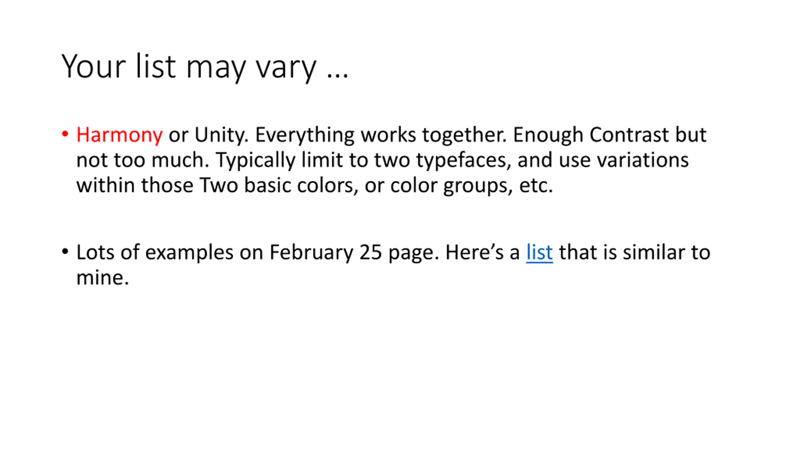 Your list may vary Harmony or Unity. Everything works together. Enough Contrast but not too much. Typically limit to two typefaces, and use variations within those Two basic colors, or color groups, etc. Lots of examples on February 25 page. Here s a list that is similar to mine.