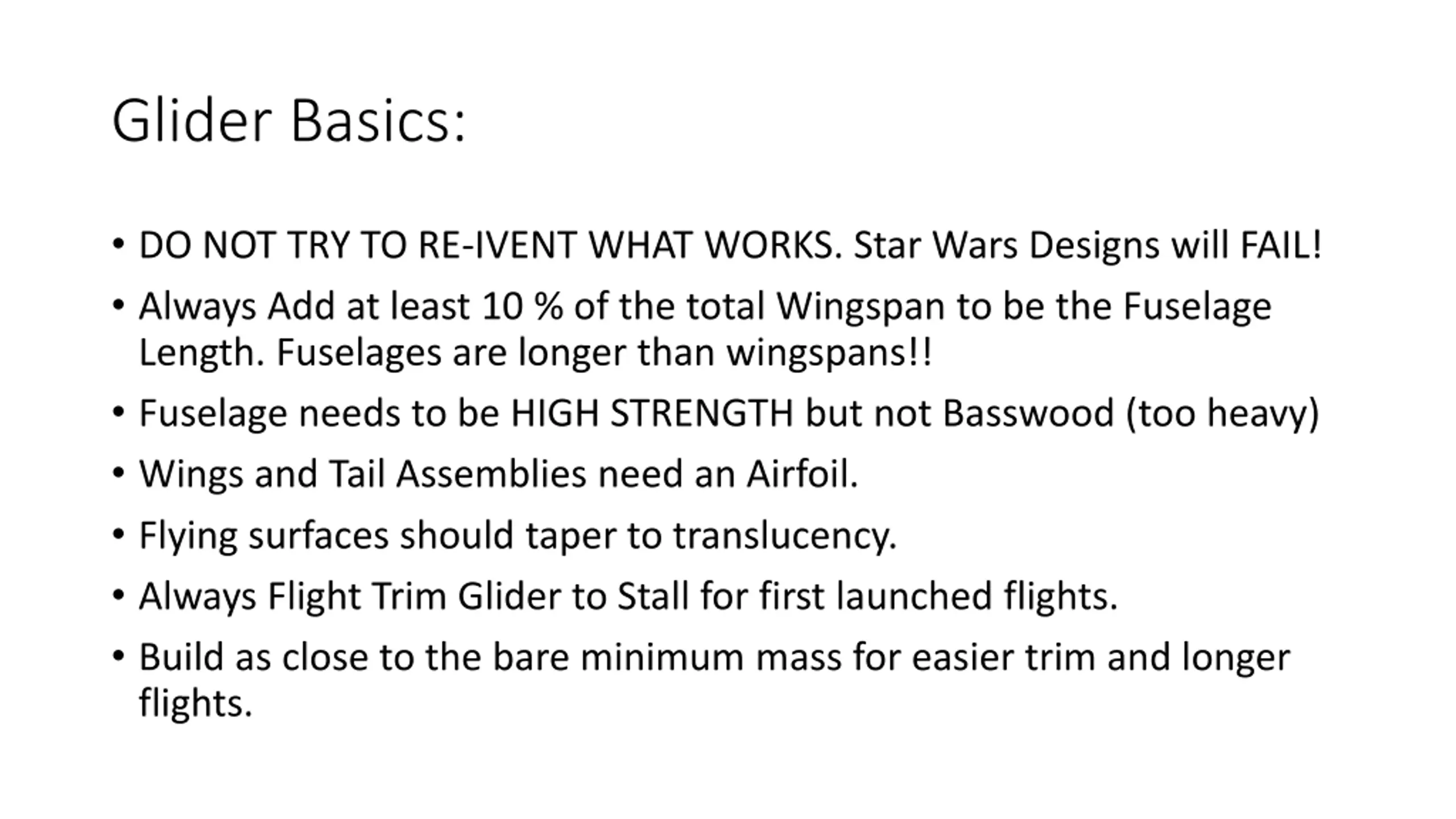 Glider Basics: DO NOT TRY TO RE-IVENT WHAT WORKS. Star Wars Designs will FAIL! Always Add at least 10 % of the total Wingspan to be the Fuselage Length. Fuselages are longer than wingspans!! Fuselage needs to be HIGH STRENGTH but not Basswood (too heavy) Wings and Tail Assemblies need an Airfoil. Flying surfaces should taper to translucency. Always Flight Trim Glider to Stall for first launched flights. Build as close to the bare minimum mass for easier trim and longer flights.