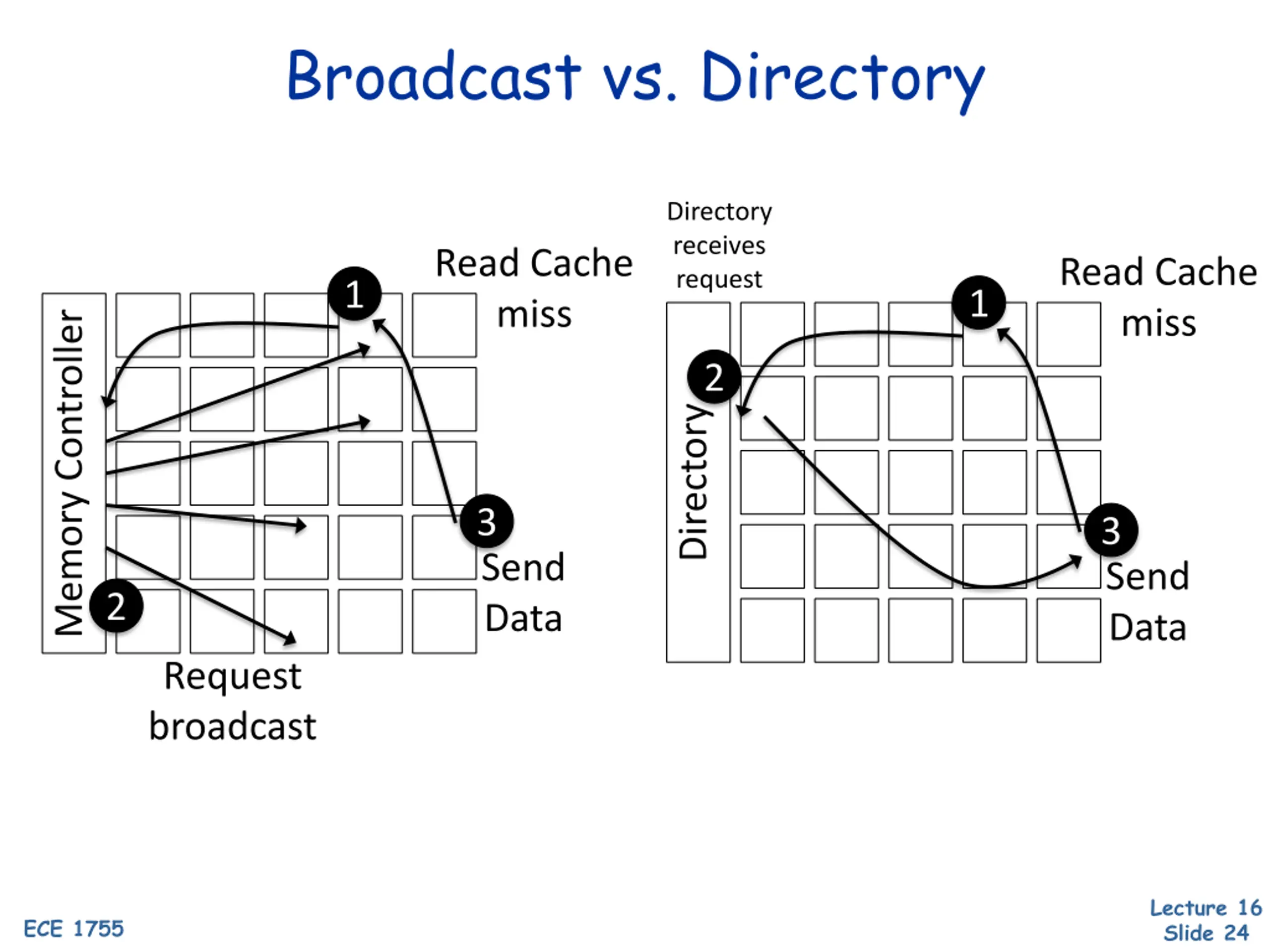 Broadcast vs. Directory Directory receives request Read Cache miss Read Cache miss 1 1 Memory Controller 2 Directory 3 Send Data 3 Send Data 2 Request broadcast Lecture 16 Slide 24 ECE 1755