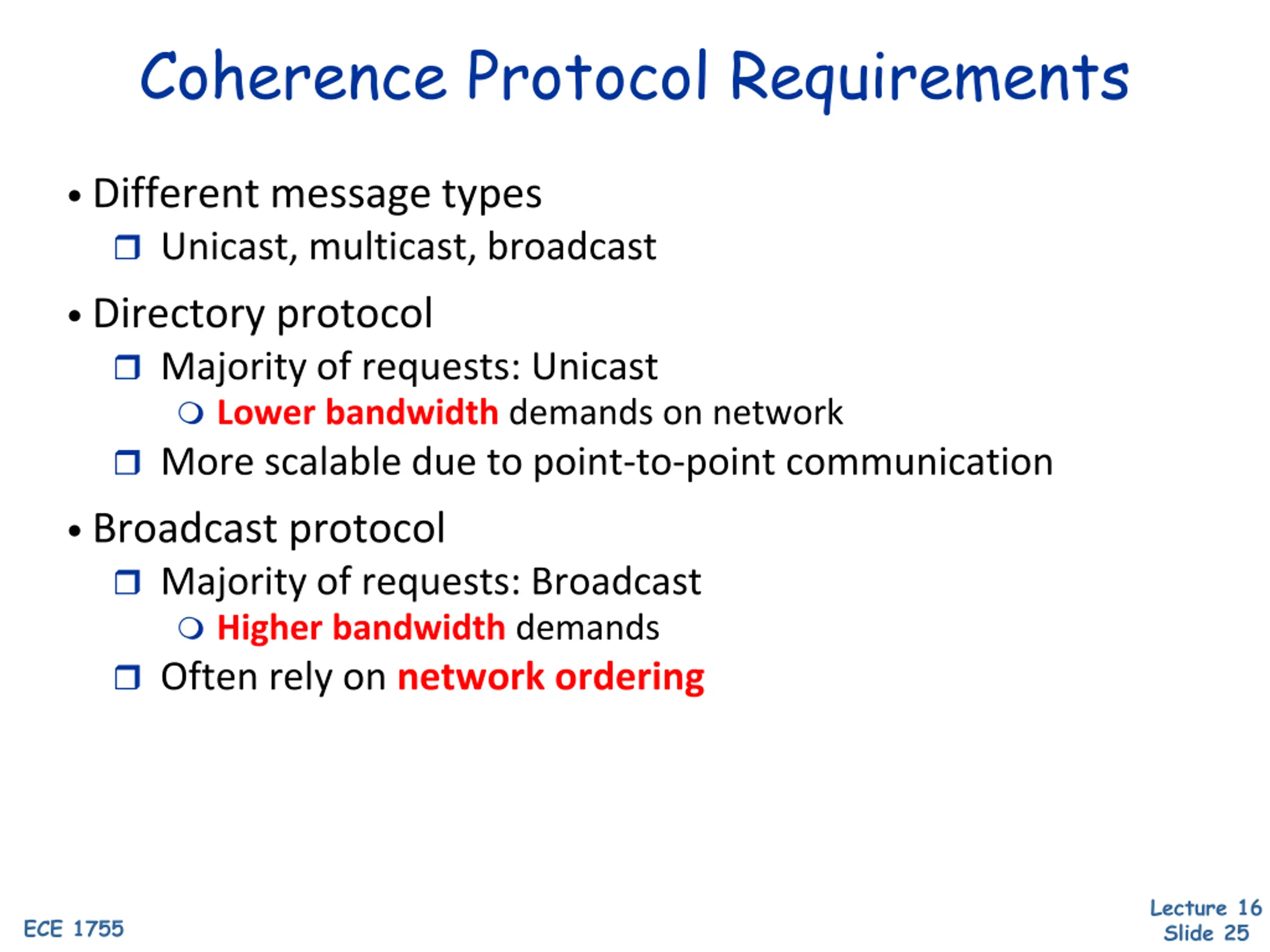 Coherence Protocol Requirements Different message types Unicast, multicast, broadcast Directory protocol Majority of requests: Unicast Lower bandwidth demands on network More scalable due to point-to-point communication Broadcast protocol Majority of requests: Broadcast Higher bandwidth demands Often rely on network ordering Lecture 16 Slide 25 ECE 1755